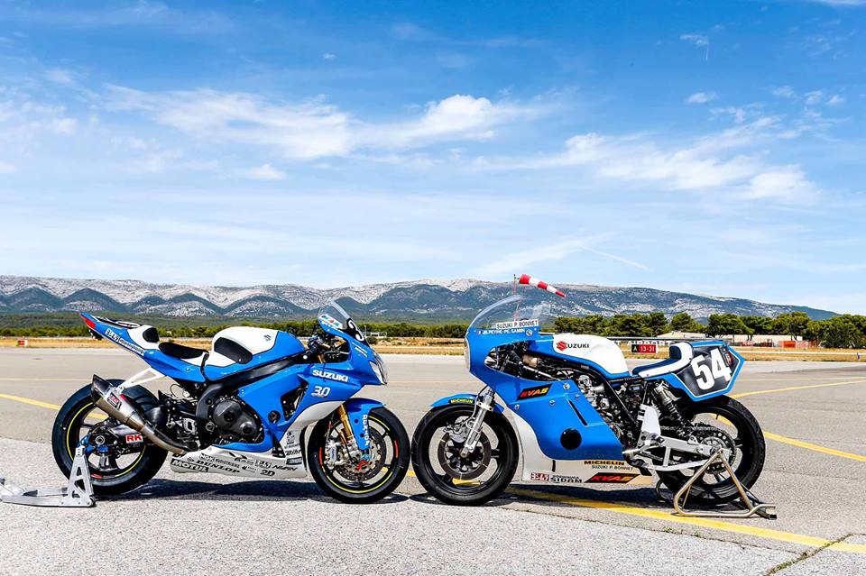 Unglaublicher Aufwand bei den Franzosen: Yamaha zum 60. Geburtstag komplett neu in Gelb, Suzuki zum 30. GSXR-Geburtstag im Design der Langstrecken GS1000 von 1980.