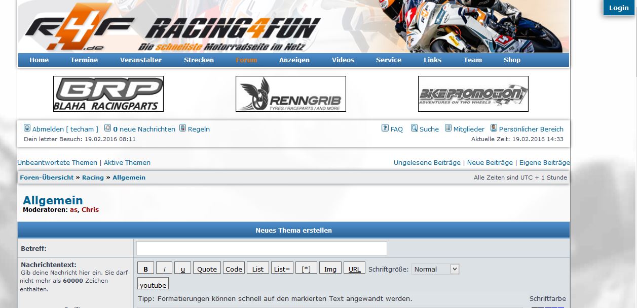 Die ganze zeit bleibt allerdings oben Rechts der Login Button, während oben Links steht ich bin eingelogt und kann meinen Benutzer techam abmelden. Einzige Einschränkung ist, dass ich werder den Anzeigenmarkt, noch die Aufzünderkartei nutzen kann.