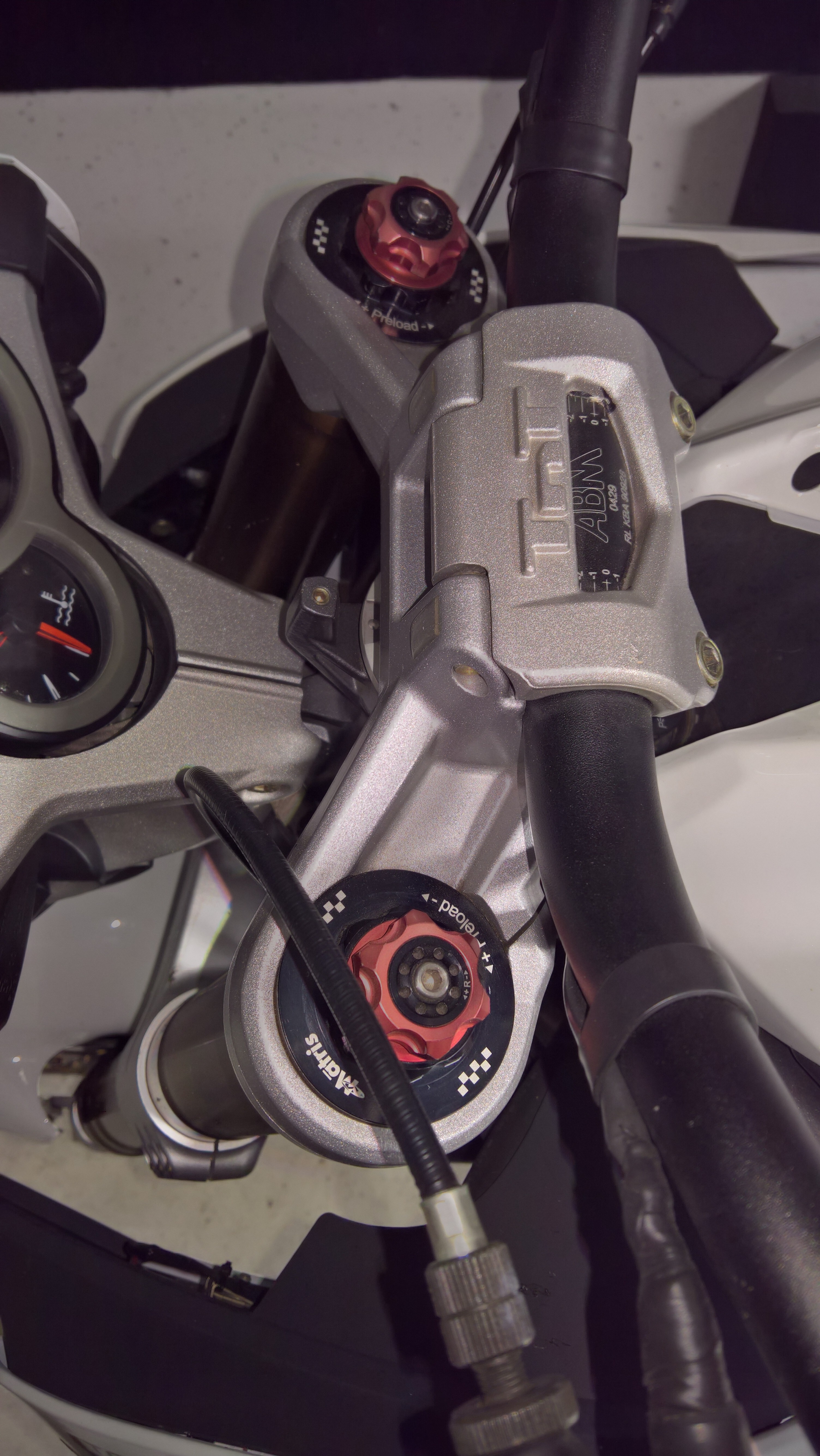 Gabel scheint ganz herkömmlich aus zum verstellen. Preload wird die Vorspannung sein und oben Zugstufe. Unten an der Gabel Druckstufe. Beim Federbein kannst denk ich bei einem Rad Lowspeed und am anderen Rad Highspeed Druckstufe einstellen können. Unten wird Zugstufe sein. Schau mal hier: