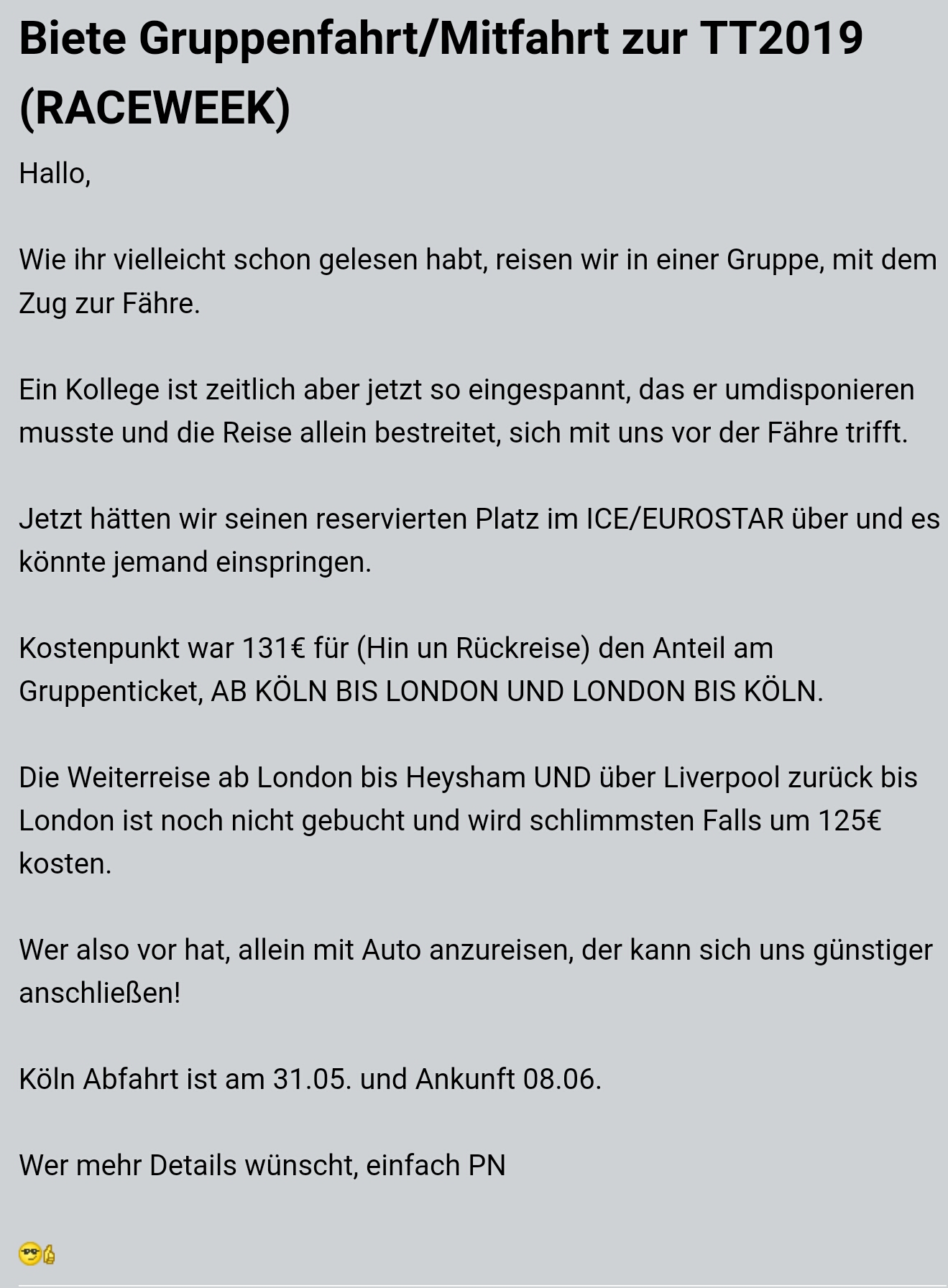 Was die Fahrt von BRD nach GB betrifft, wir sind da echt geesprächsbereit, bezüglich der ursprünglichen Kosten!