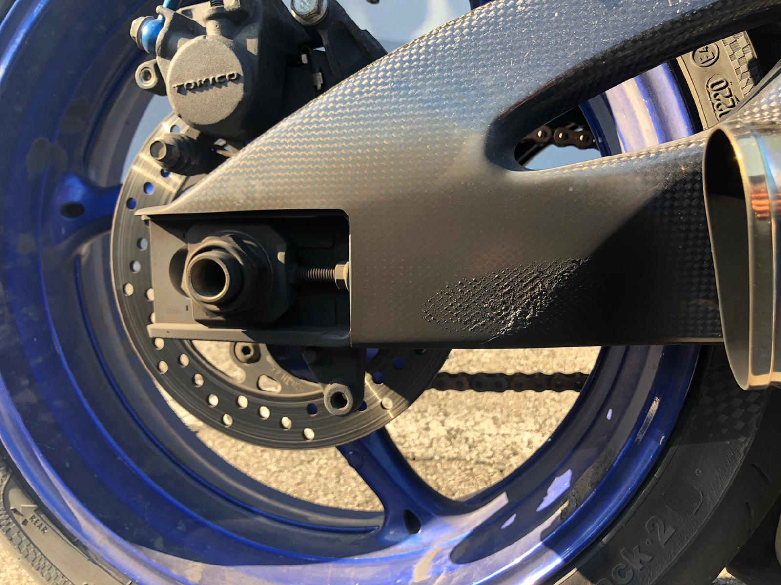 Nun bin ich letzte Woche mal 100km gemütlich gefahren und gestern nochmals 200km mit Zeitweise schon straff gespannten Gasseil und hohen Drehzahlen wenn die Strecke kurvig war und passte. Abgesehen davon dass mein Schwingenschoner durch die ungünstige Form der Yoshimura komplett verkohlt ist (werde ich noch ausschneiden) merkte ich auch dass die Schwinge, Steckachse und Mutter komplett schwarz waren, hatte ich vor der Abstimmung zwar auch schon, aber niemals in diesem Ausmaß!