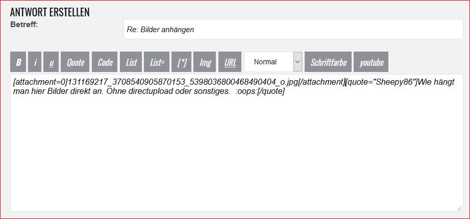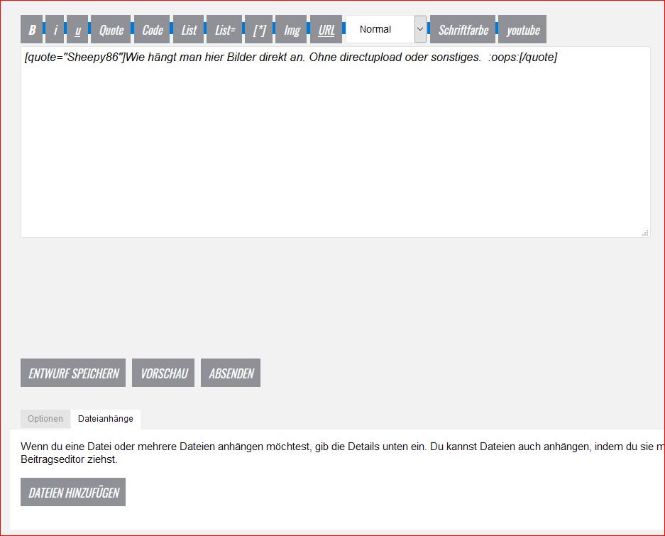 Unten auf den Reiter "Dateianhänge",Sheepy86 hat geschrieben:Wie hängt man hier Bilder direkt an. Ohne directupload oder sonstiges.