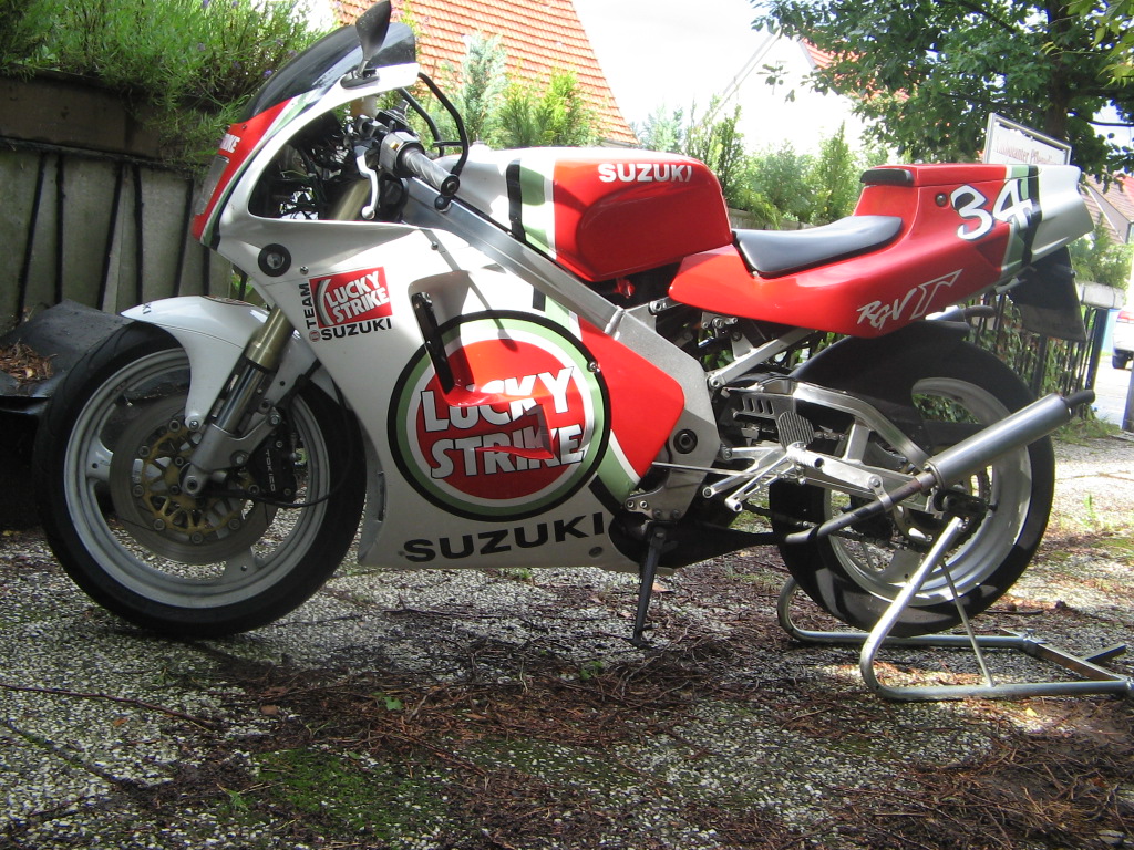 Es fing 2005 an, ich hab mir direkt nach dem Abitur für heute lächerlicherweise unter 2000€ eine sehr gut erhaltene RGV 250 Baujahr 92 mit 16000km weitestgehend original gekauft. Mein Traum war eigentlich eine RS250, als angehender Student hatte ich keine Kohle für das Ding und bin zur RGV gegangen. Ich musste das Teil eigentlich noch mit 34ps fahren, hier das älteste Foto vom Moped, den Auspuff hab ich relativ kurz nach dem Kauf dazugekauft. Bestimmt nicht viel mehr als die 34PS