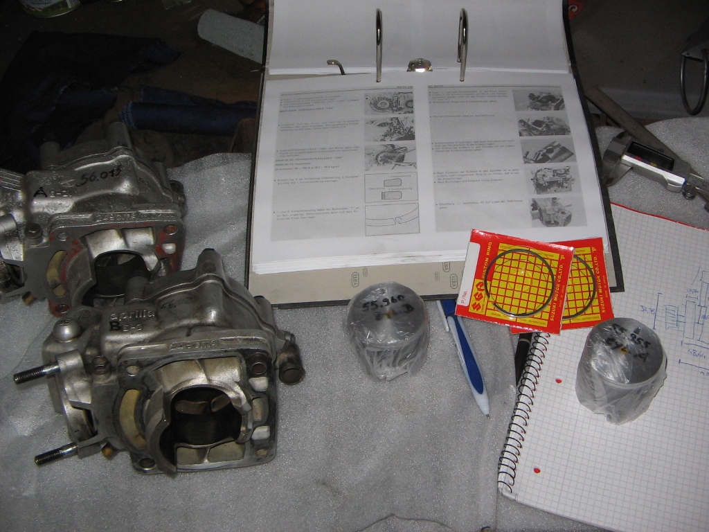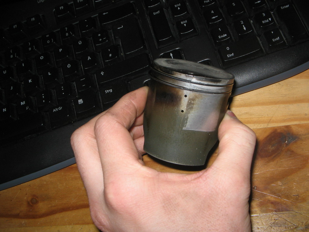 Kurz vorher bei der Durchsicht ist mir aufgefallen, dass der Kolben vom stehenden Zylinder aufgrund zu hoher Verdichtung angefangen vom festen ins flüssige Überzugehen. Also fix vorher ohne nachzudenken Zylinder runter, zum Vermessen und neuen Kolben bestellt.