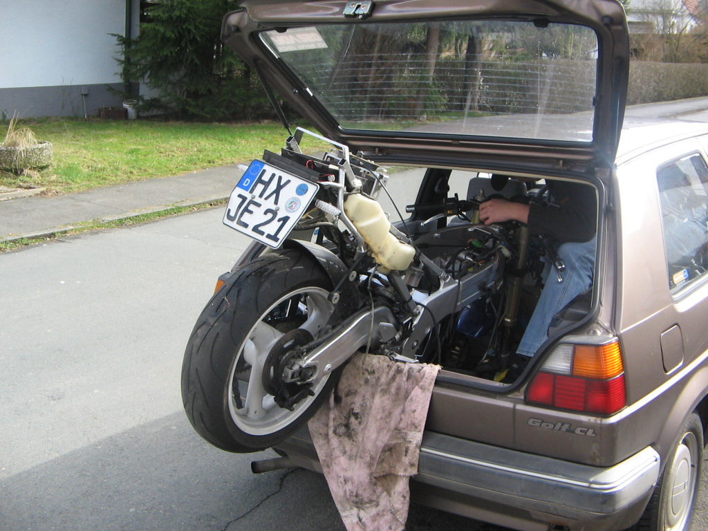 Als echter Tuner hab ich also nicht für einen ersten Ausflug die Lampen abgeklebt und die Spiegel abgeschraubt, sondern stattdessen alles rausgeworfen, was nicht gebraucht wird, das komplette Heck umgebaut, weil ich auch einen umgebauten Heckrahmen bekommen hab und so aber auch mal eben knapp nur noch 132Kg mit Getriebe-, 2T-Öl und ein paar Litern Sprit gewogen. Bei irgendwo um die 56-60Ps am Rad schon okay.