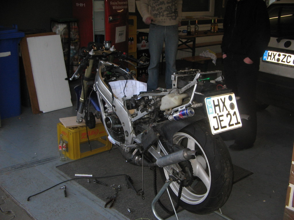 Jedenfalls weiter in der normalen Reihenfolge des Pfusches. Als krasser Tuner (Sportauspuff war dran, 34Ps Drossel raus) musste das Ding natürlich auf den Prüfstand. Was liegt näher, als beim Tag der Offenen Tür vom Örtlichen Suzuki Dealer für 25 € oder sowas vor Kuchenessender Kundschaft gute Luft zu machen... Leider ist sie dem Händler beim Hochschieben vom Prüfstand gefallen und mit dem Auspuff auf die Kante vom Prüfstand gestürzt. Als krasser Tuner sagt man nichts zu dem Scheißladen, sondern macht halt sein Ding. Mit der Eisensäge zersägen, ausbeulen und GP Style wieder zusammenschweissen (Junge Junge, Papier lässt sich leichter Schweissen als der Kack Auspuff):