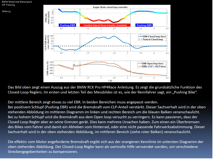 Von der Theorie her, habe ich das für mich jetzt so einsortiert: Wenn ich auf die Kurve zufliege und in die Bremsphase bin, dann brauche ich am Anfang ein hohes EBR und zum Scheitelpunkt muss es immer weniger werden. Ab einem gewissen Punkt muss die Fuhre "neutral" sein. Hier ist es aber eine Gratwanderung und es muss vermieden werden, dass durch das Reduzieren der EBR das Moped in einen Schiebebetrieb kommt.