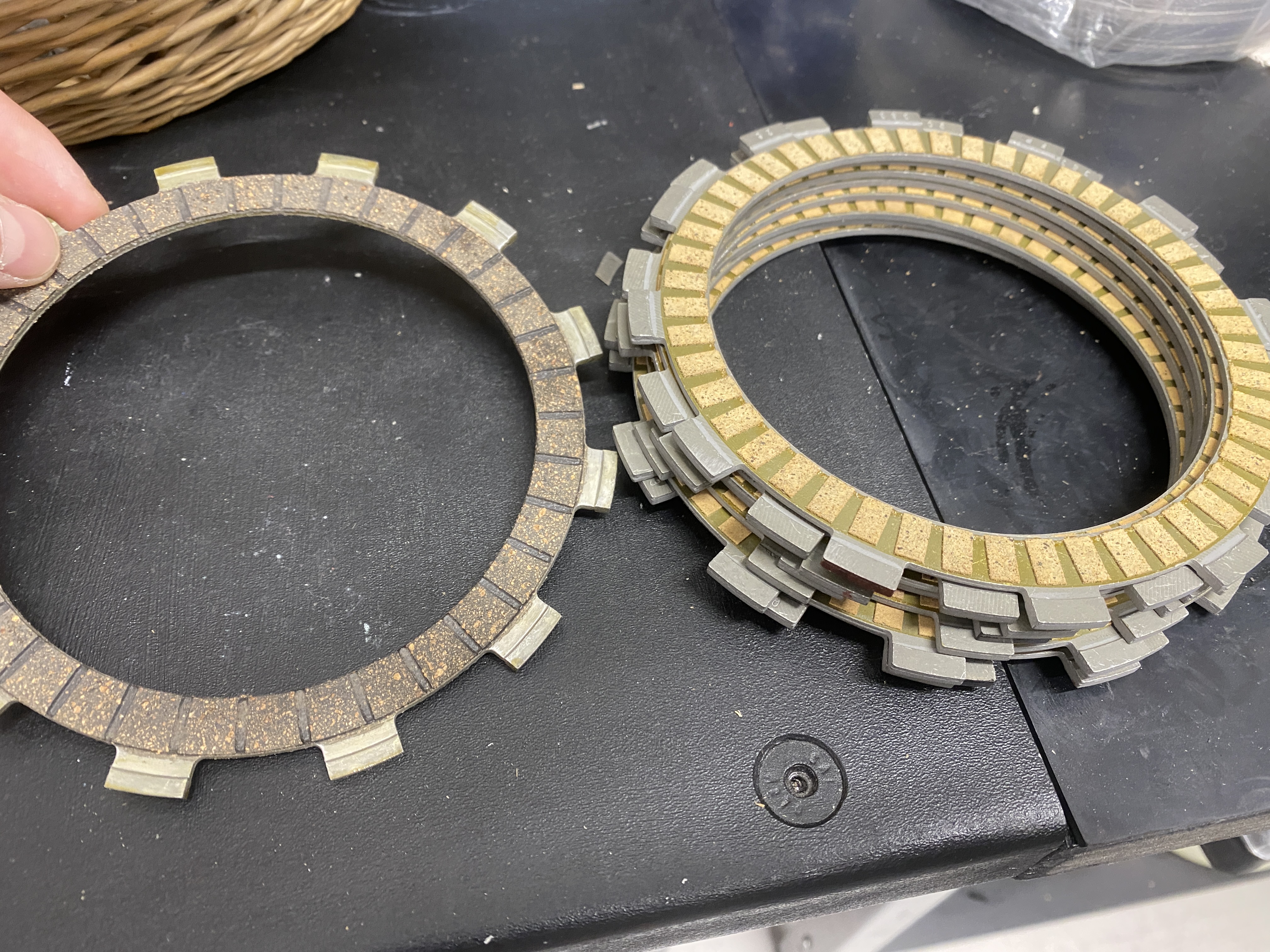 jetzt hat da eine Reibscheibe einen anderen Belag wie die 8 anderen!