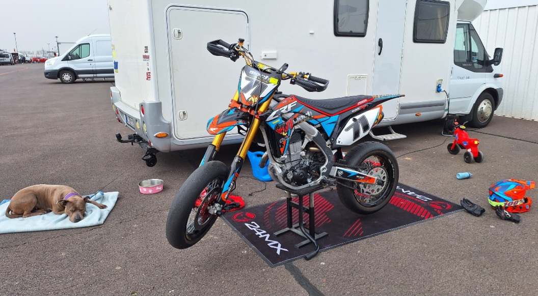Im Vorfeld hab ich ein 4-Tonnen Wohnmobil mit Heckgarage für ein Motorrad angeschafft und die PC37 von meiner Frau mit Rennverkleidung, TD-Slicks und Blade-Bremse ausgestattet. Wohnmobil in der Grösse, weil ich dieses Jahr oft Supermoto fahren und es wohnlich und anhängerlos haben will. Desweiteren wurde ein alter Pferdeanhänger in dem fortan die beiden Supersportler reisen sollen. Einfach den günstigsten Pferdeanhänger mit TÜV im Umkreis ausgesucht, Plane geflickt, neuen Boden verlegt, Vorderradwippen im Boden verankert und oben eine zweite Ebene für Gepäck angebracht.
