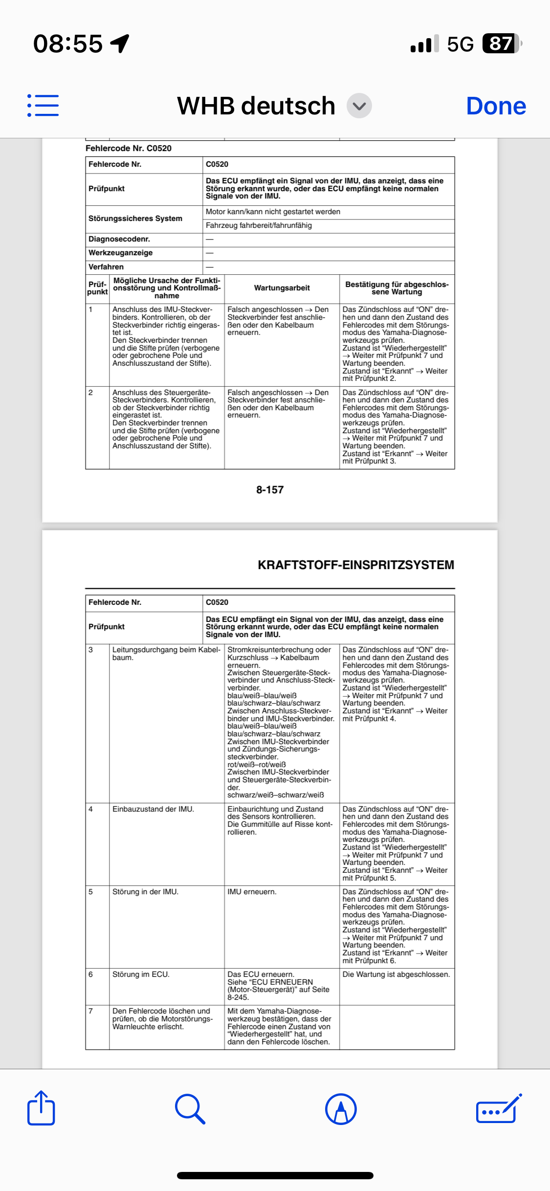 C0520 sagt im Handbuch: ECU bekommt falsches Signal von der IMU. Einzige Sofortmaßnahme die möglich war, war alle Steckverbindungen der ECU kontrollieren. Konnte nichts feststellen.