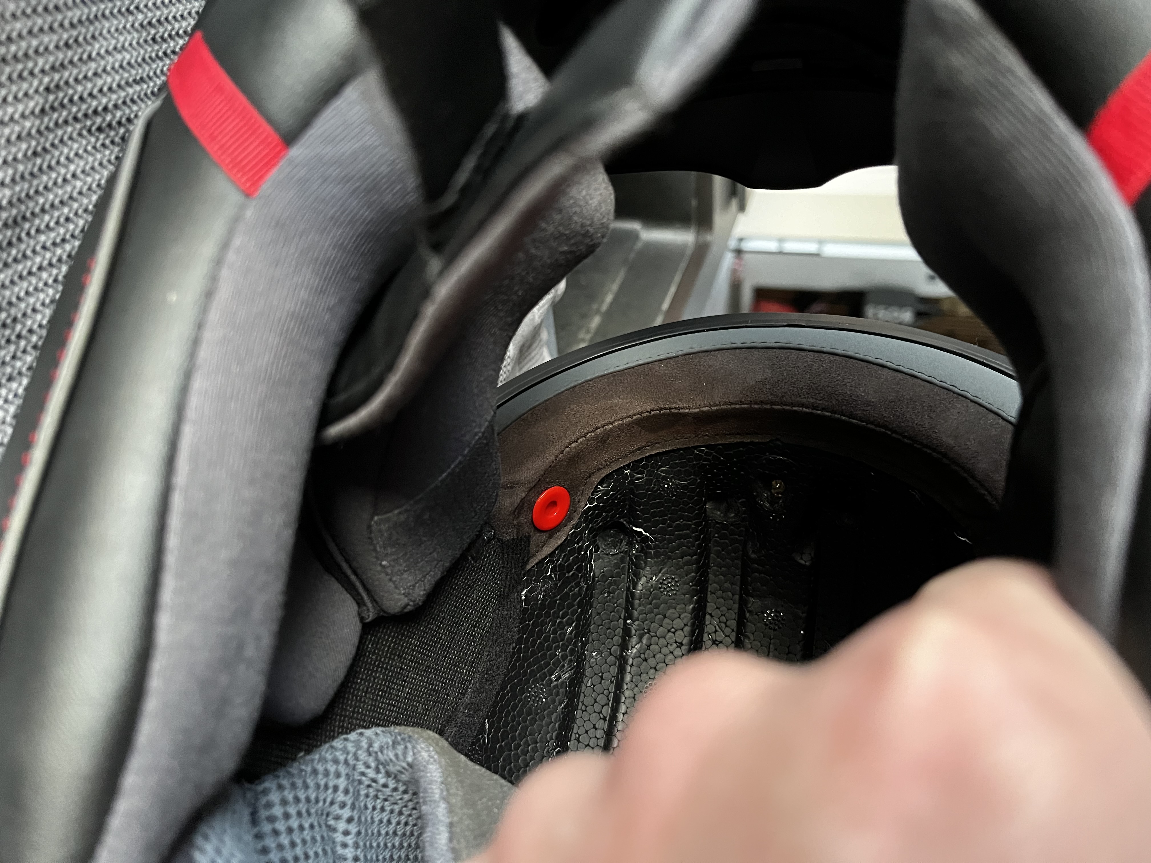 Nach ner längeren Ausfahrt (Nacked) drückt das immer noch arg… es ist der Druckknopf vom Innenfutter. Der ist auch echt dämlich positioniert… genau an den Anlageflächen zum Kopf…