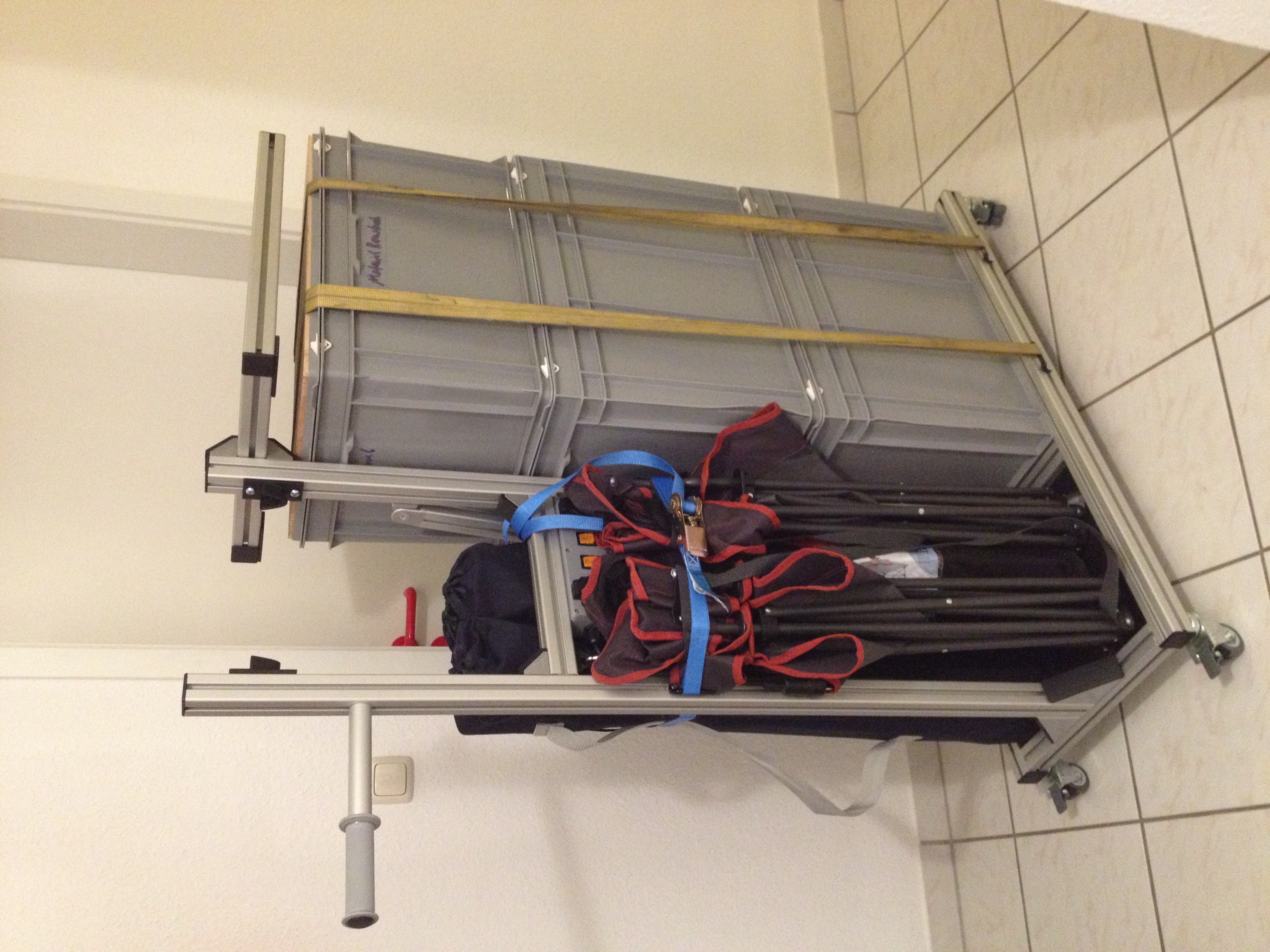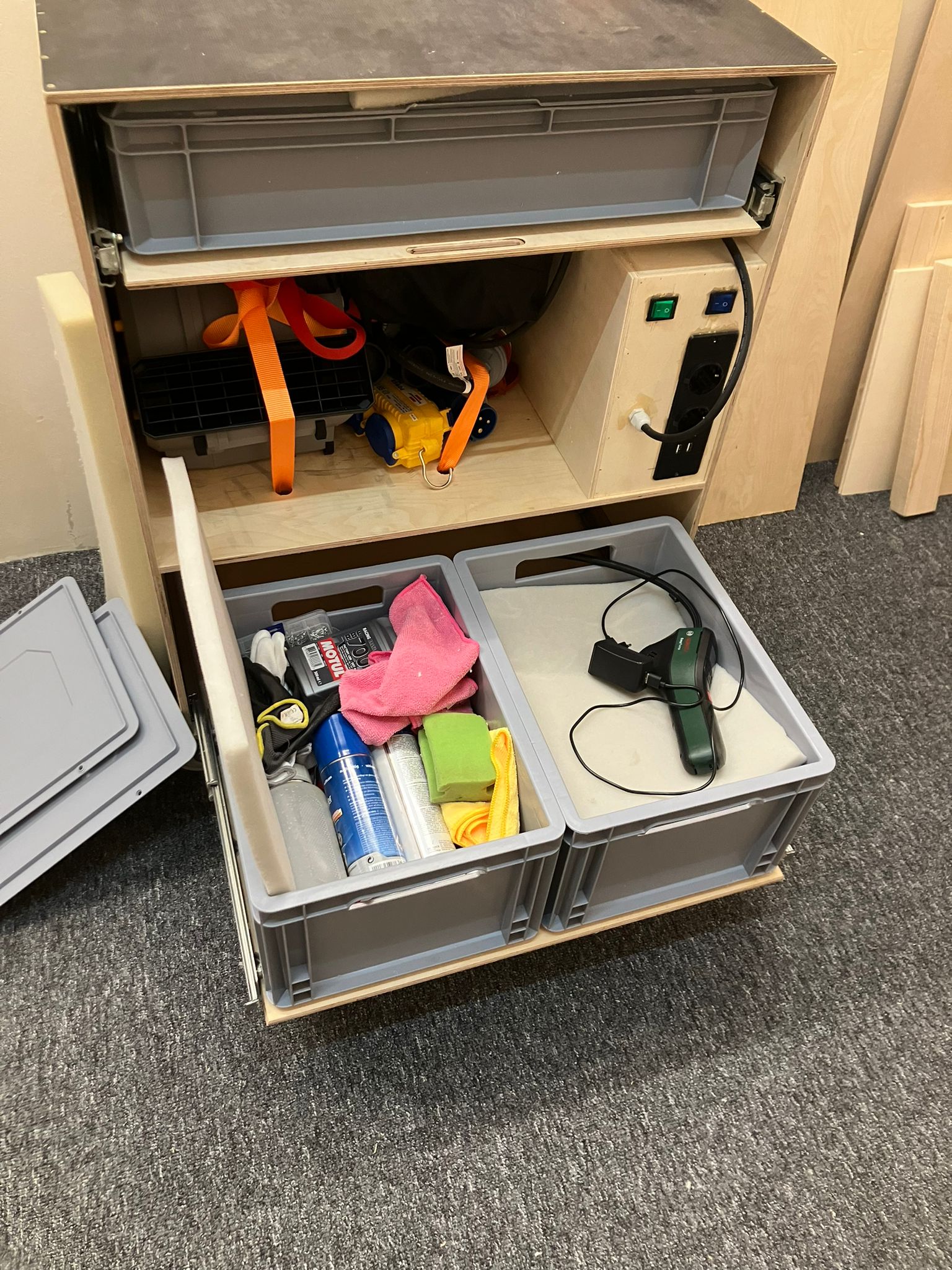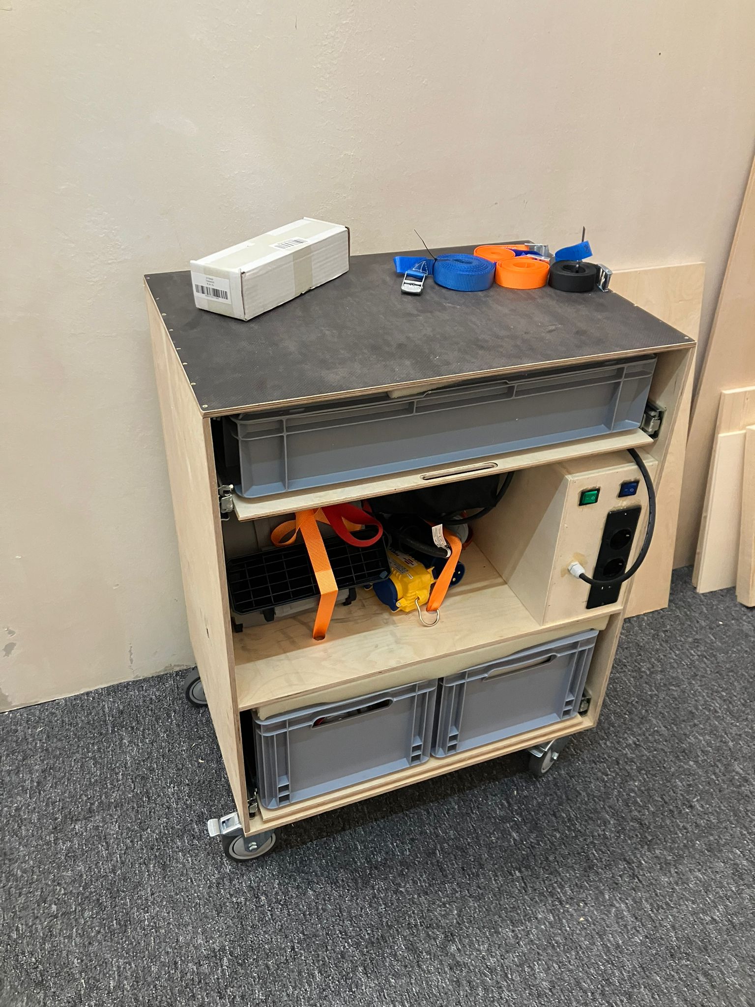 Ich habe mir einen Wagen gebaut incl. Kramboxen auf Auszügen, Tischfläche, schaltbaren Steckdosen und schaltbaren Dosen am Kabel für die Reifenwärmer. Dazu links und rechts noch steckbare Achsen um Räder unterzubringen fürs Vorheizen.