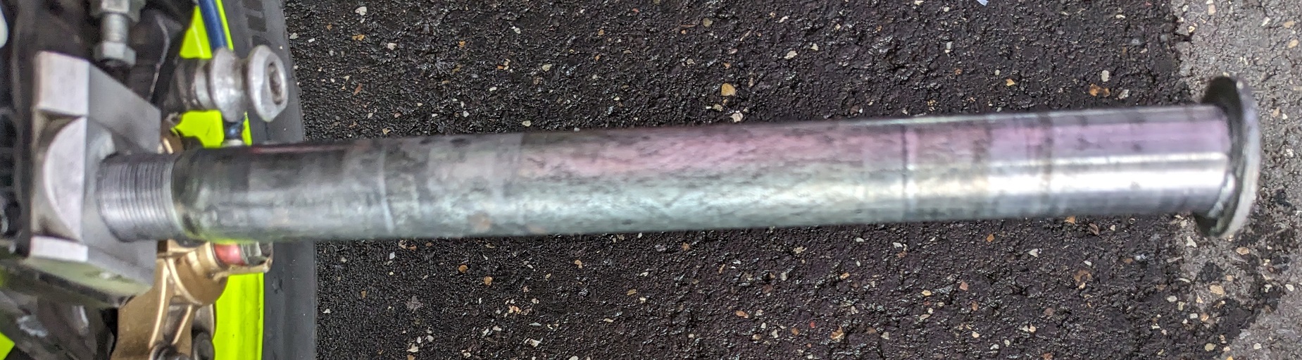 Bei meiner Schnellwechselachse (zur Veranschaulichung von der falschen Seite in den Kettenspanner geschraubt) ist der drangeschweißte Kopf abgerissen. Flansch-Teil ist ein Einsatz mit 1/2 Zoll Aufnahme. Passt satt in die Achse und war irgendwie von innen verschweißt. Jetzt ist der mit etwas Krafteinsatz frei drehbar in der Achse und rauskloppbar.