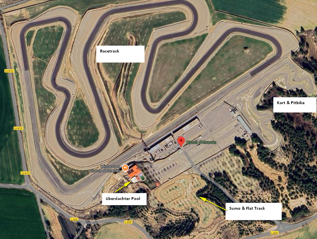 Hallo, wir fahren im Oktober zum dritten Mal in Folge mit HPS nach Alcarras. Hatten die beiden letzten Jahre sehr gute Bedingungen (letztes Jahr ein Vormittag abtrocknende Strecke). Strecke macht super Spaß und open Track über alle drei Tage echt entspannt. An einem Abend noch mit spanischen Abend im Restaurant, der Pool stand allerdings jedes Mal trocken sodass sich bei den Frauen die Begeisterung in Grenzen hielt und aufs Shoppingcenter ausgewichen wurde. Sanitäre Einrichtungen sind vorhanden. Im ersten Jahr waren auch Jorge Martin und Fermin Aldeguer an der Strecke mit ihren Supermoto, sensationell beim zuschauen und echt volksnah. Lärmbeschränkung= 0.
