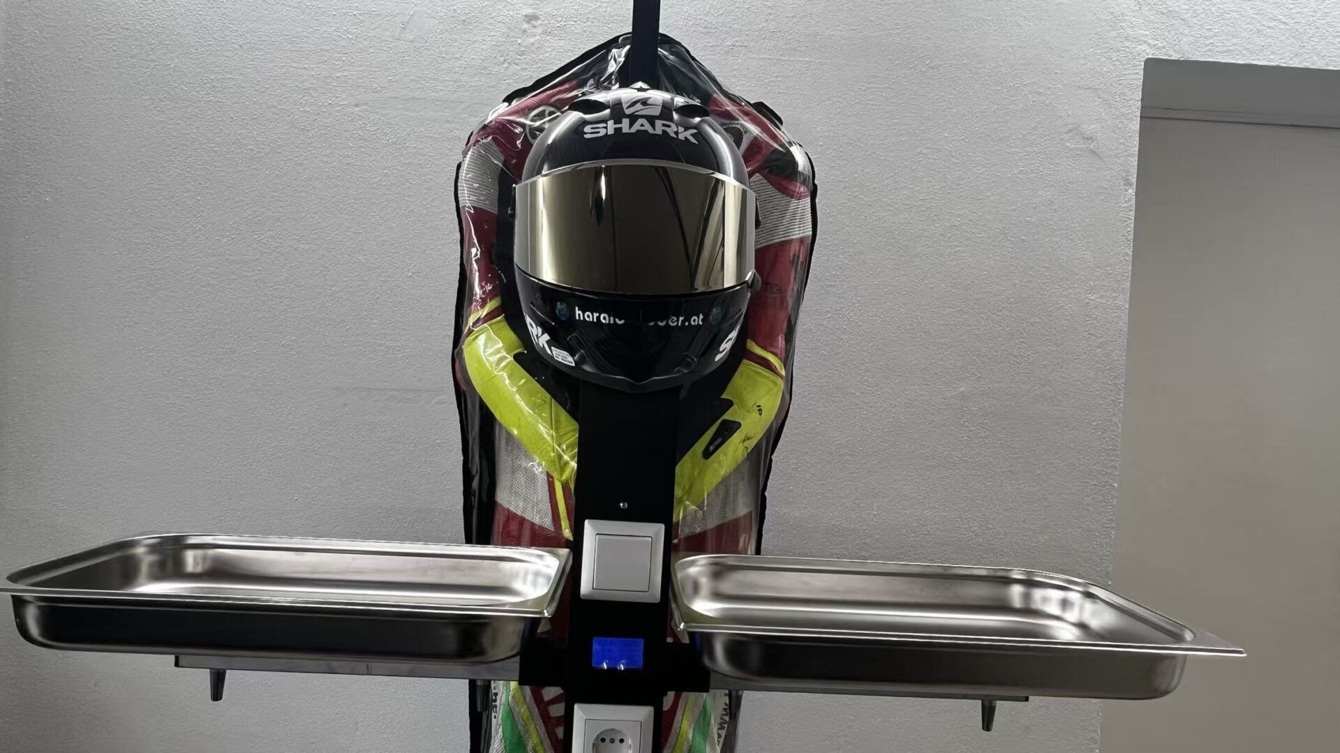 Aufhängungen: Stangen für Rennanzug, Unteranzug, Stiefel und weiteres Equipment.