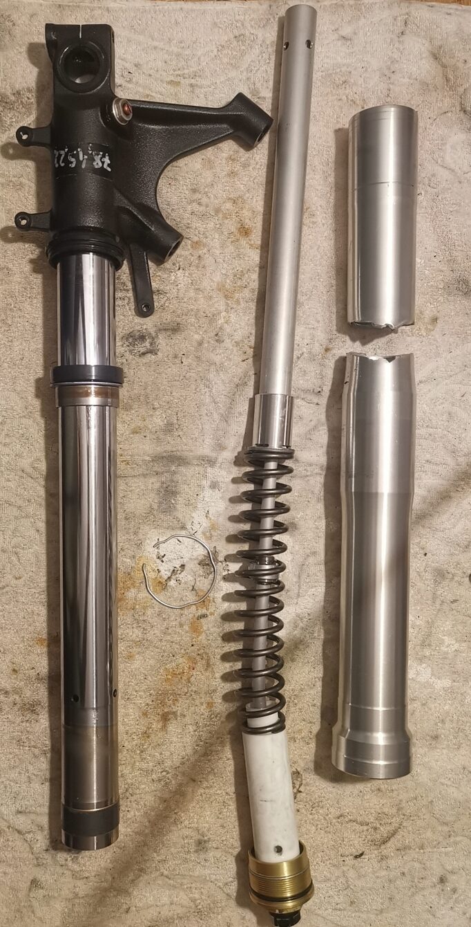 Nach meinem letzten Sturz in Mettet ist an meiner SC57 die Gabel gebrochen. Genau gesagt, nur der rechte Tauchrohr (gebrochen) und die Cartridge mit Feder sind verbogen.