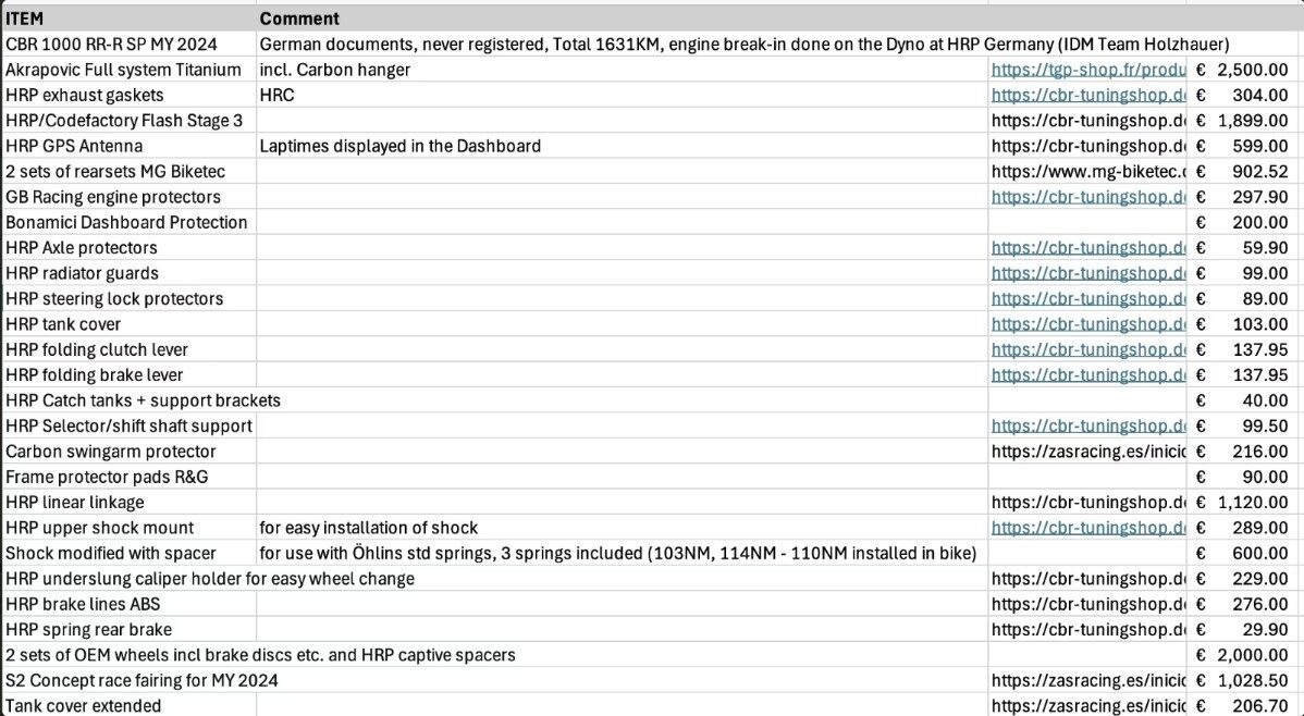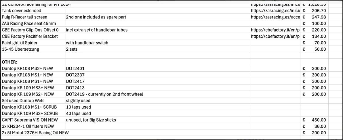 Sämtliches Zubehör, sowie neue Dunlop KR Big Size Slicks, neue Capit Suprema Vision Reifenwärmer usw. --> Siehe Liste unter Fotos.