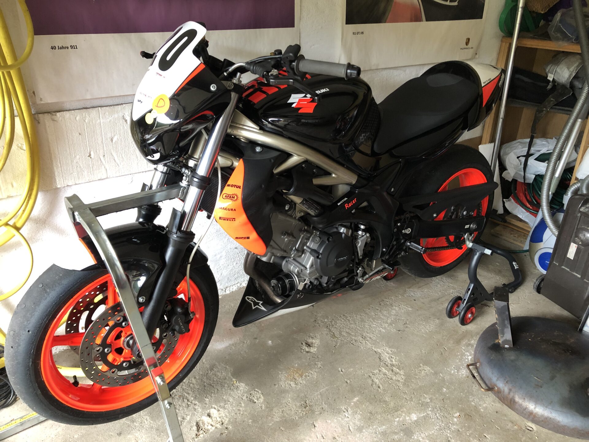 Schöne Suzuki Gladius mit Mupo-Federbein, andere Gabelfedern, LSL Rasten, Magura-Bremse, Stahlflexleitungen, BOS Endschalldämpfer mit DB-Eater, Lithium-Batterie, Alu-Kettenrad, Racing-Tankdeckel, Schaltautomat, Kurzhubgasgriff, Pirelli Diablo Superbike 120/160,