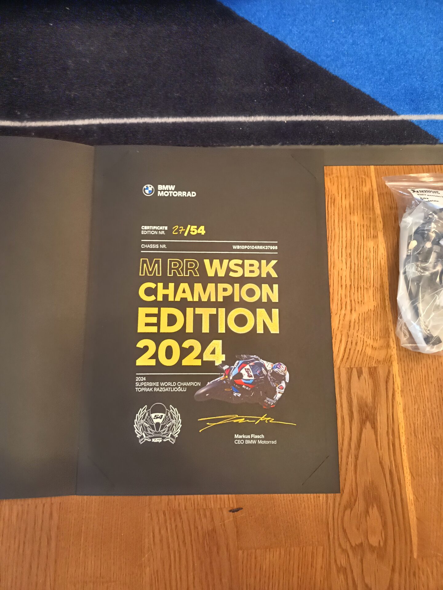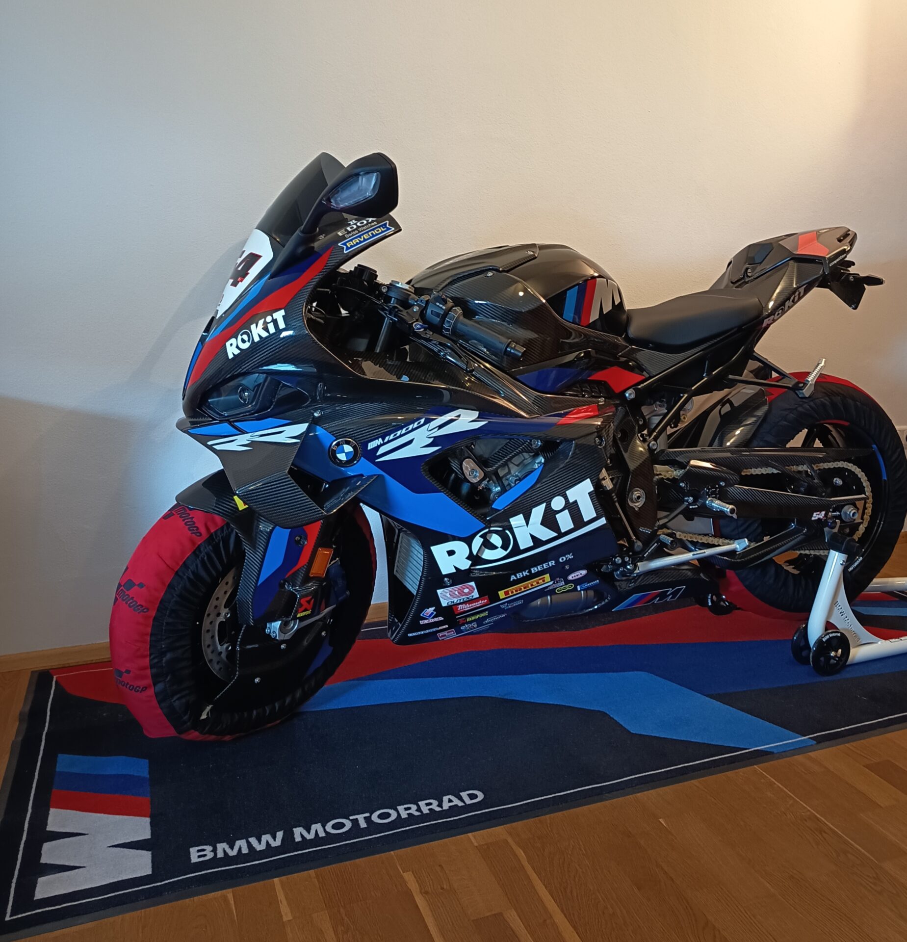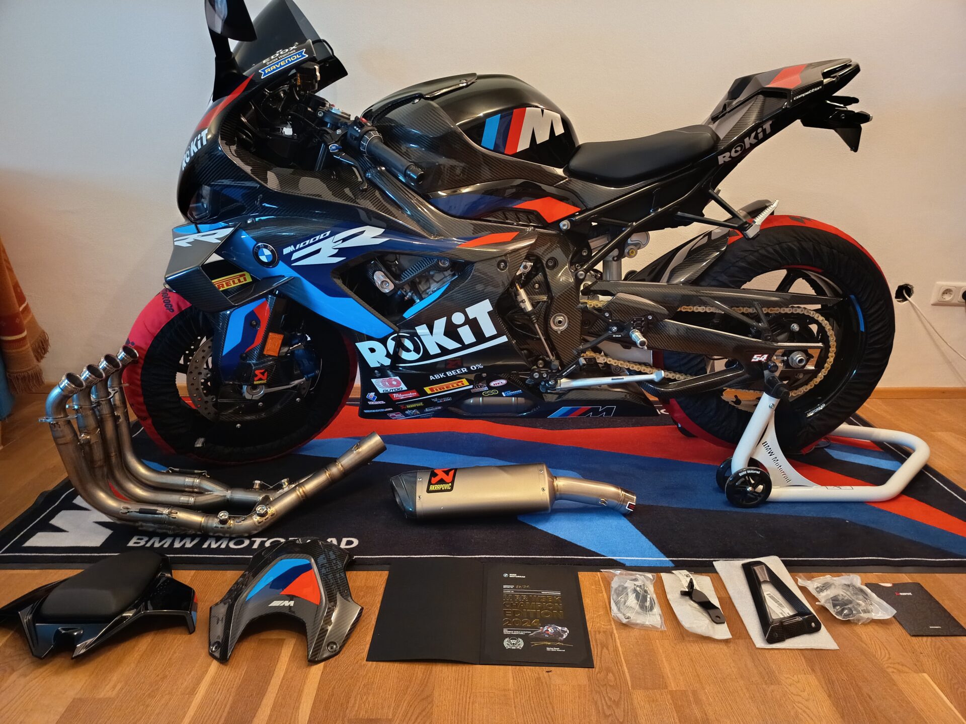 Akrapovic Racing Evolution Line Titan komplett Anlage, M Motorradteppich, Hinterradständer, Stickerkit, Original Tankblende, Original Soziussitz und das Echtheitszertifikat.