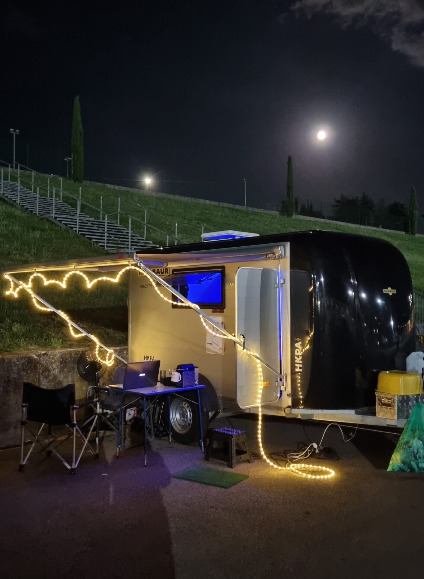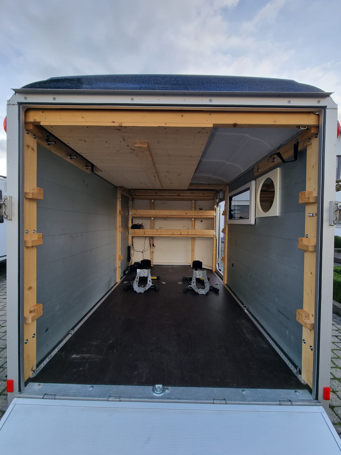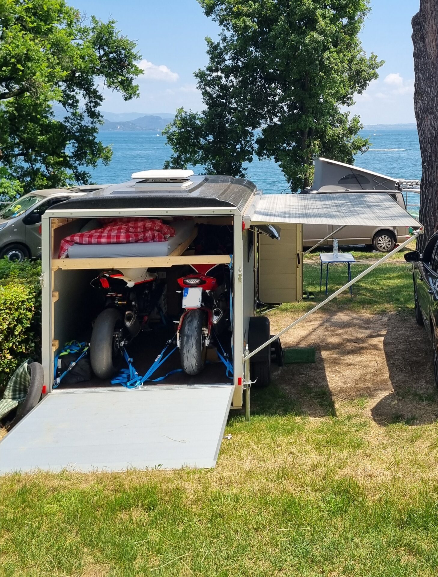 Hallo, ich verkaufe meinen Humbaur HKPA 153217 Polybug Kofferanhänger mit Auffahrrampe. Der Anhänger ist ausgebaut zum Transport von Motorrädern und zum Wohnanhänger – ich habe ihn für meine Trackdays genutzt.