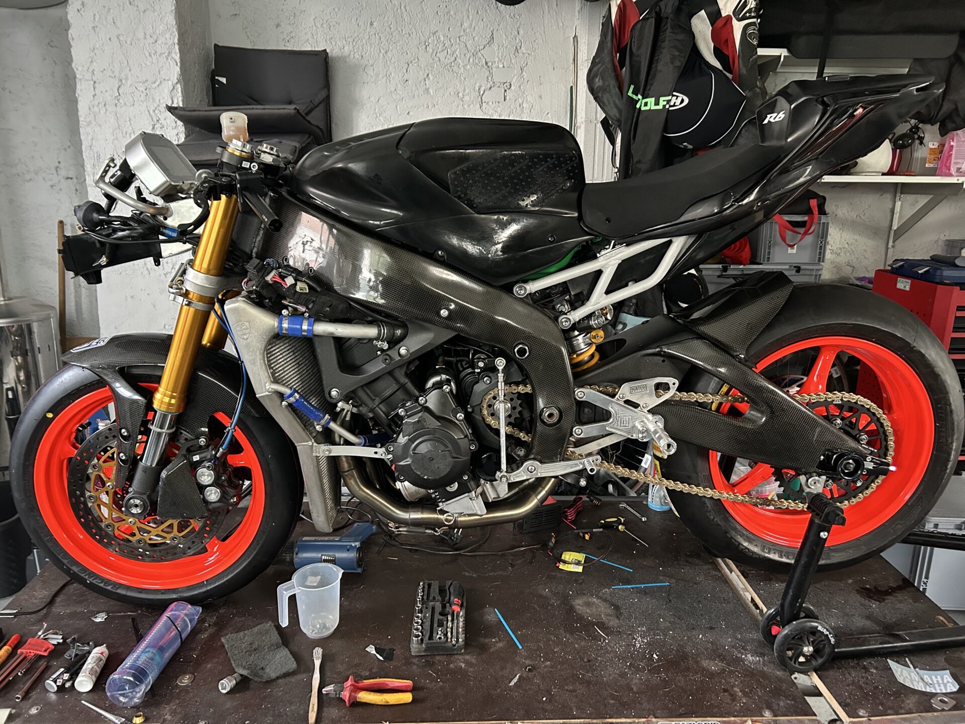 Motorrad lag rennstreckentypisch auch im Kies. Was man an zB an der Bremspumpe & Auspuff sieht. Die R6 wurde immer durch Motorsport Bornhäuser instand gesetzt.