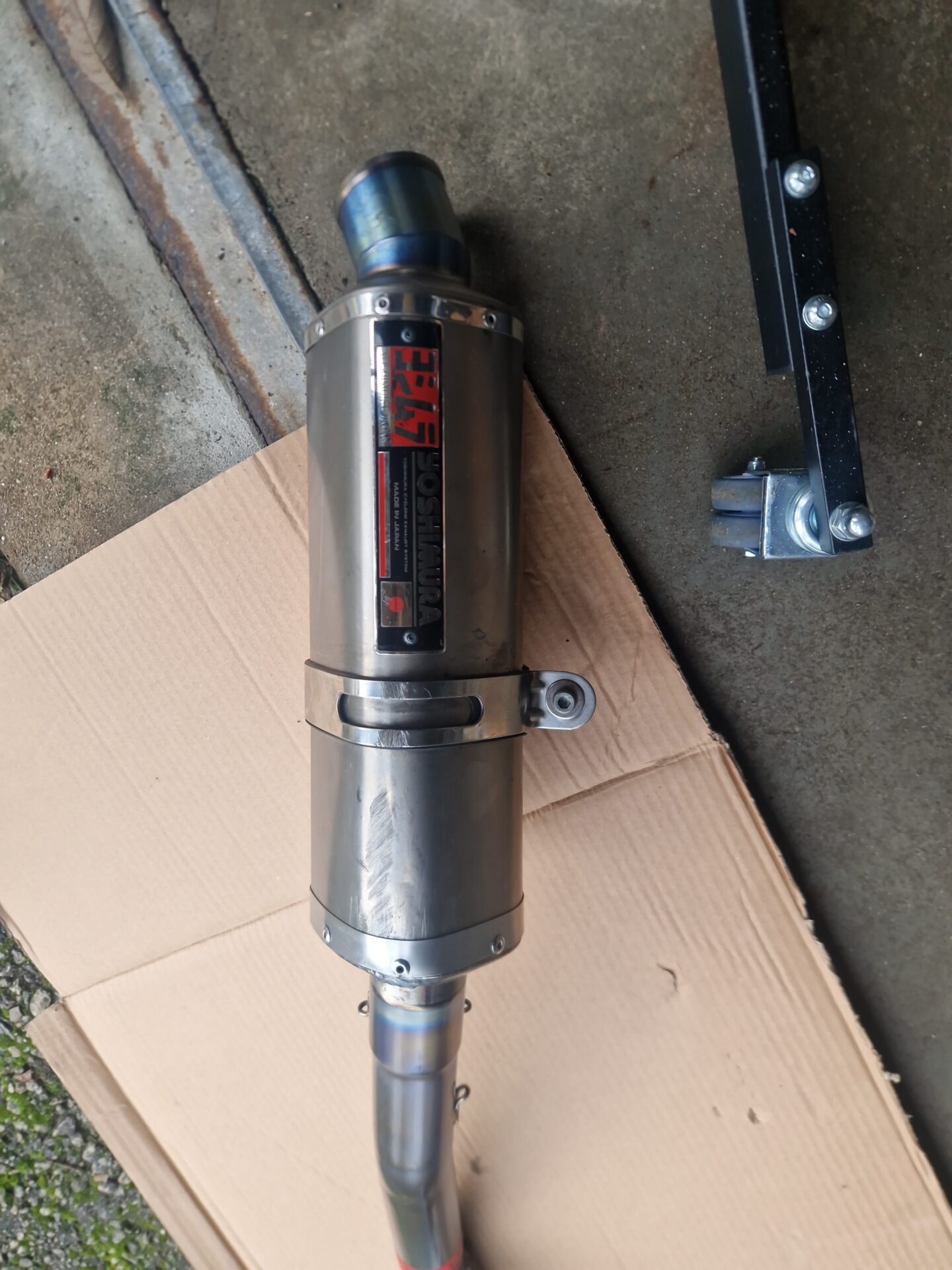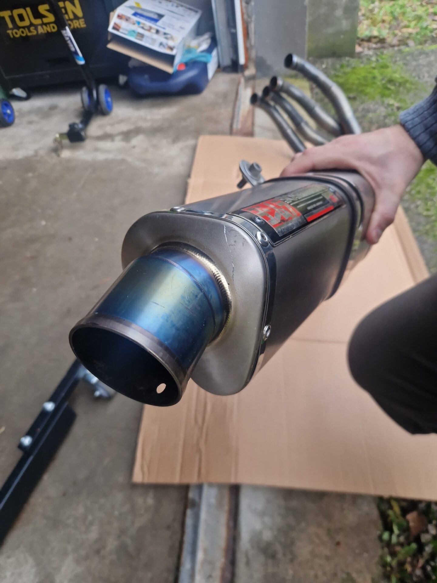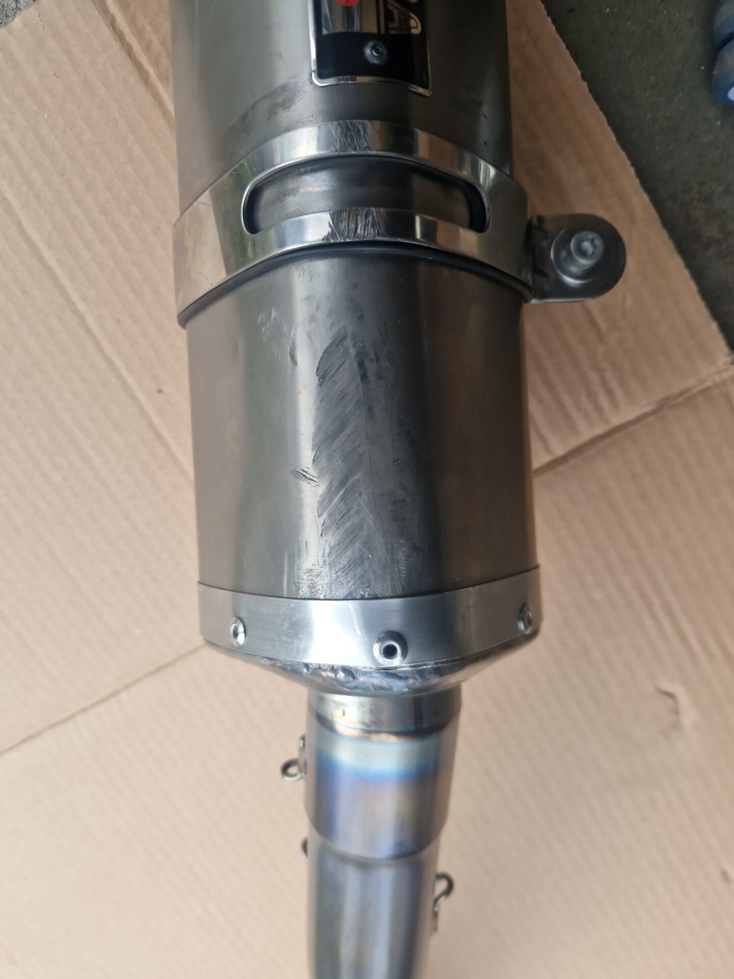 Die Anlage ist in einem guten Zustand. Wie man sieht, wurde der Endtopf mal nach einem Sturz repariert. Völlig dicht und funktioniert einwandfrei.