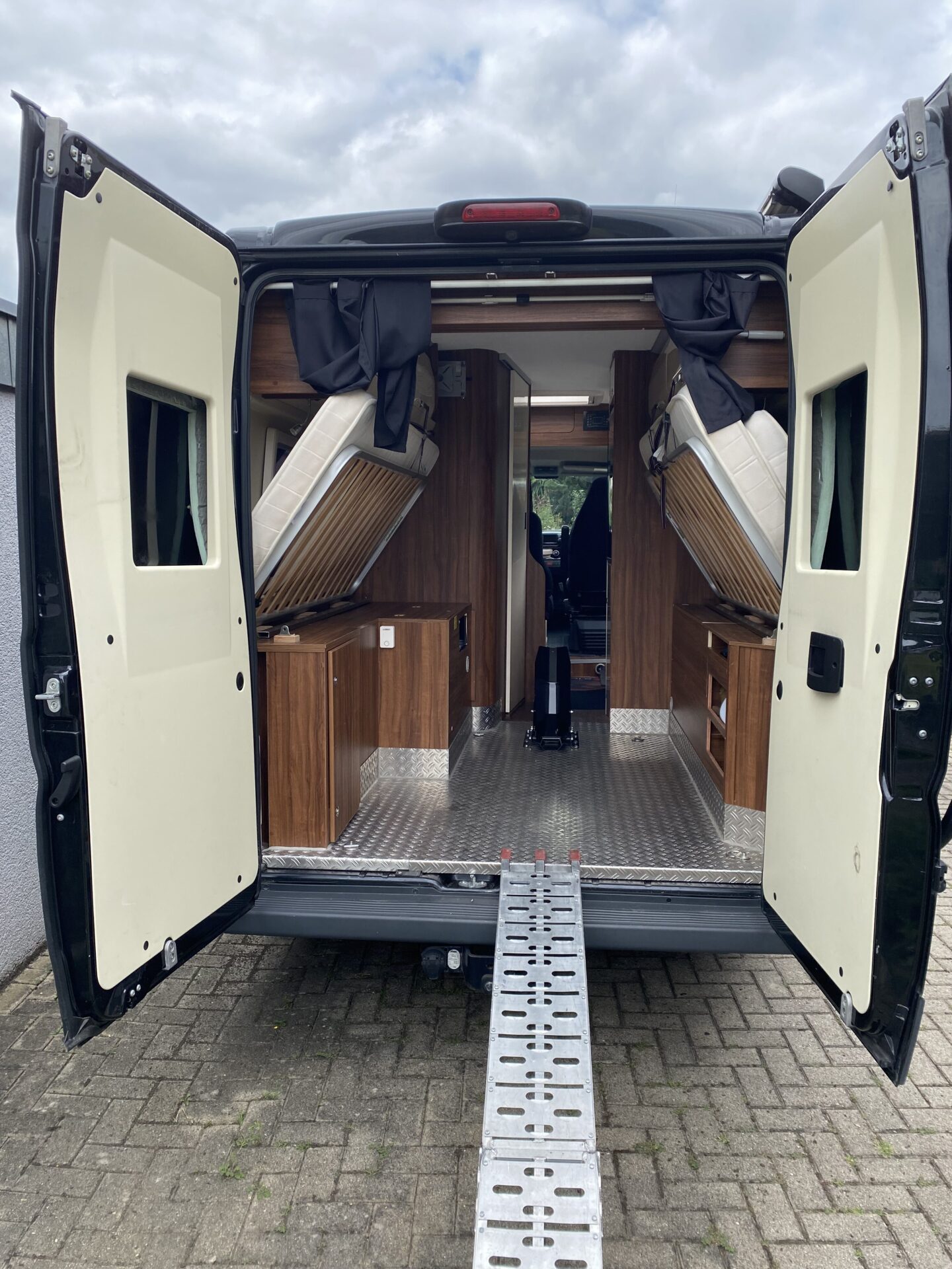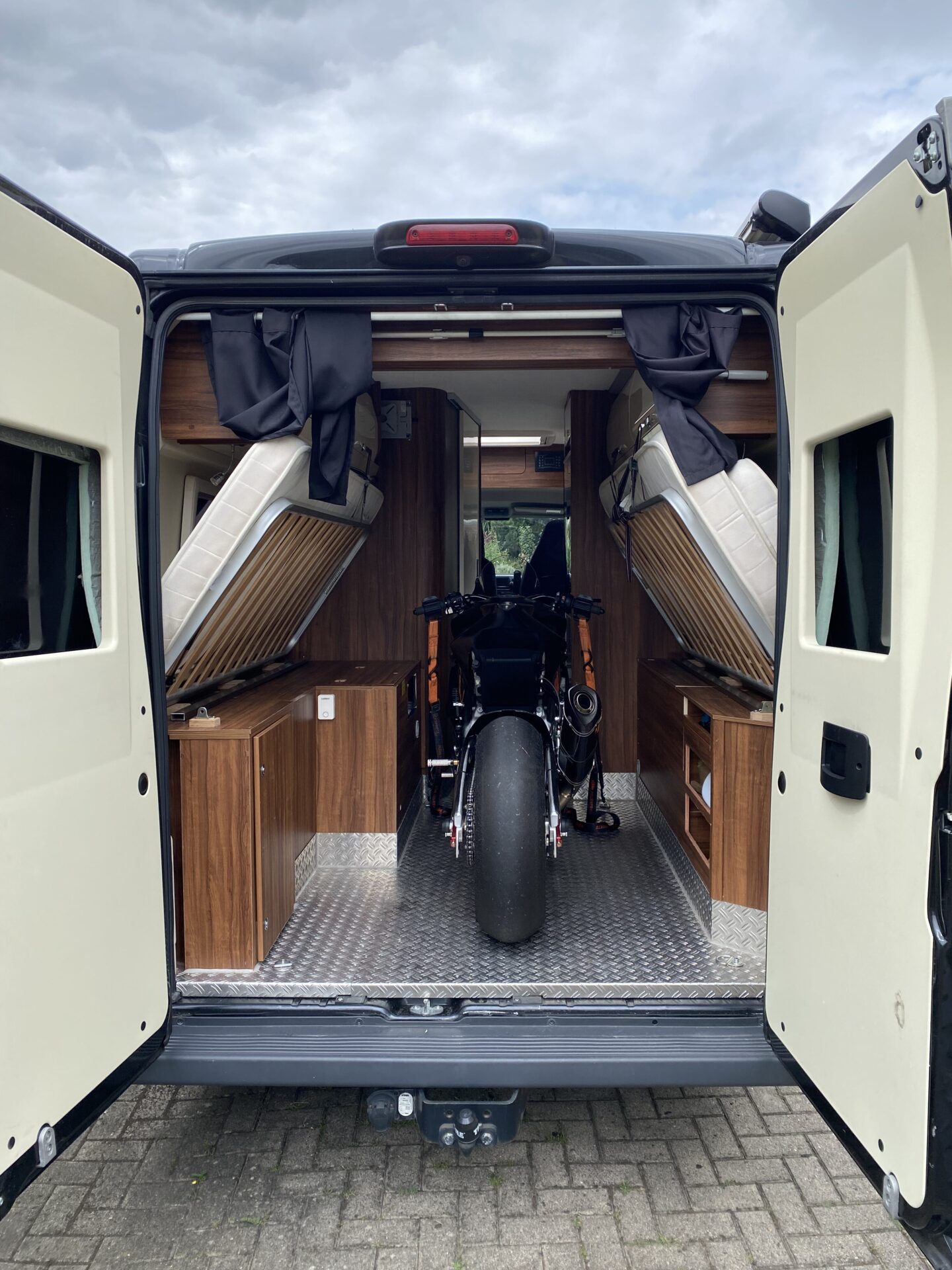 Im Gegensatz zu Modellen mit fester Heckgarage ist das Fahrzeug ohne Motorrad als vollwertiger Camper nutzbar mit ausreichend Sitzhöhe über und grossem Stauraum unter dem Bett. Der Umbau ist in 5 Min erledigt. Je nach Motorradmodell kann dieses in der Heckgarage etwas seitlicher platziert werden, wodurch ein Einzelbett genutzt werden kann ohne dass die Maschine ausgeladen werden muss - ideal für Zwischenübernachtungen auf dem Weg zum Ziel.