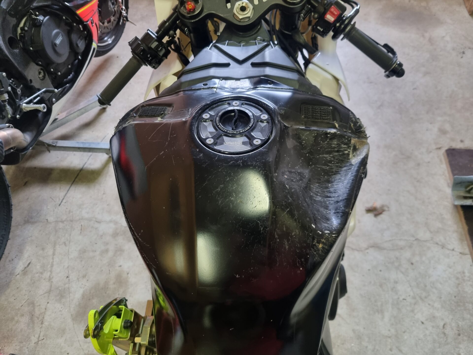 Nach Sturz im letzten Jahr, wurde sie repariert. Keine Schönheitsreparaturen. (Vermessen, Rahmen ok) Es wurde nur das technisch nötige gemacht. Ich bin seit dem 2 mal ohne Probleme damit gefahren.