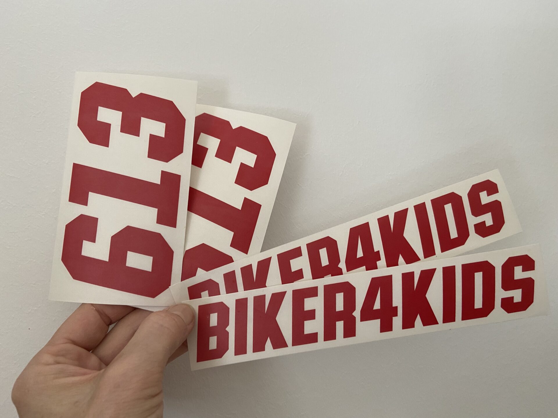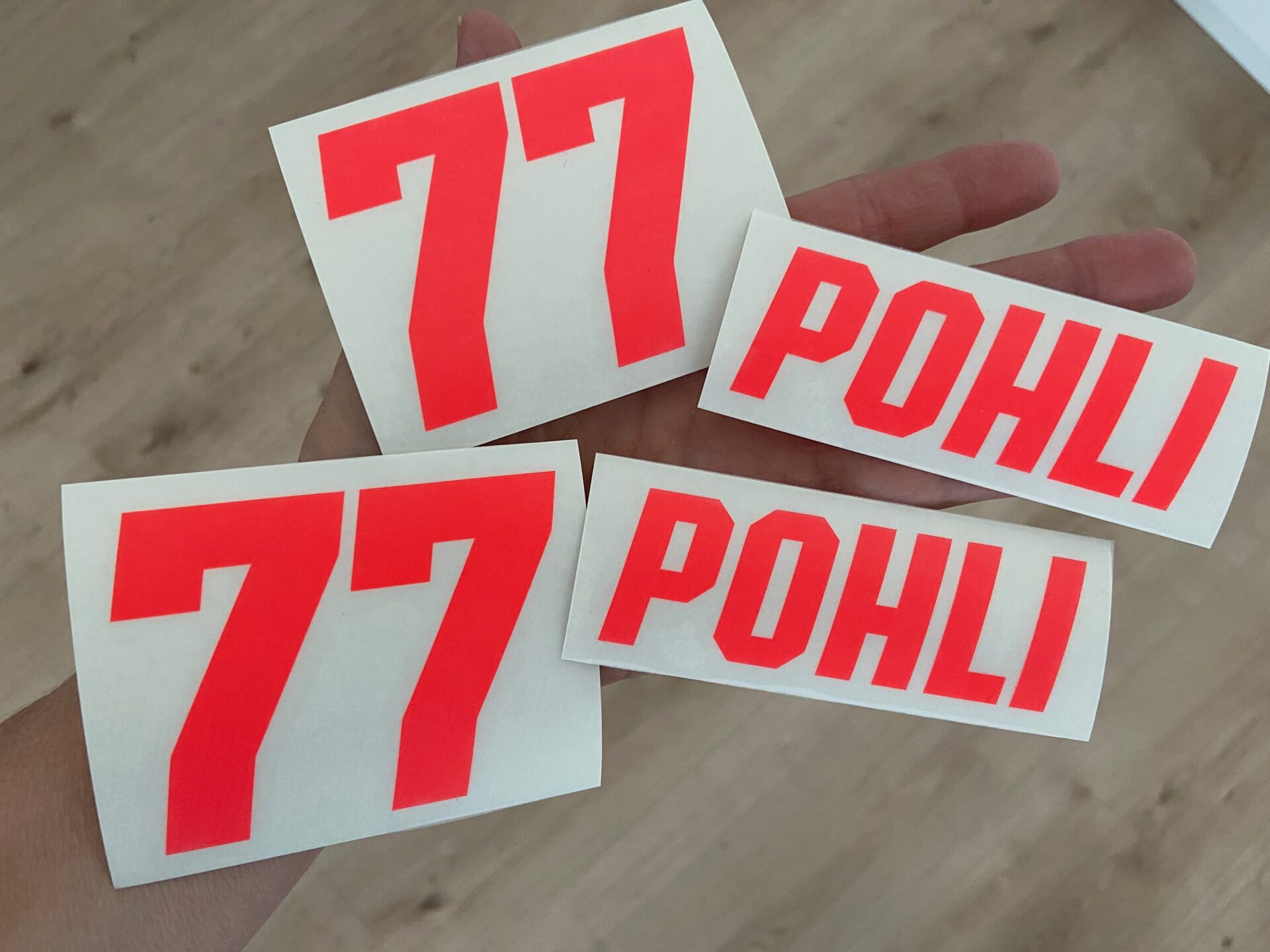 Du erhältst ein Set, bestehend aus 2x Schriftzüge (Höhe je 3 cm) und 2x Startnummern (Höhe je 6 cm).