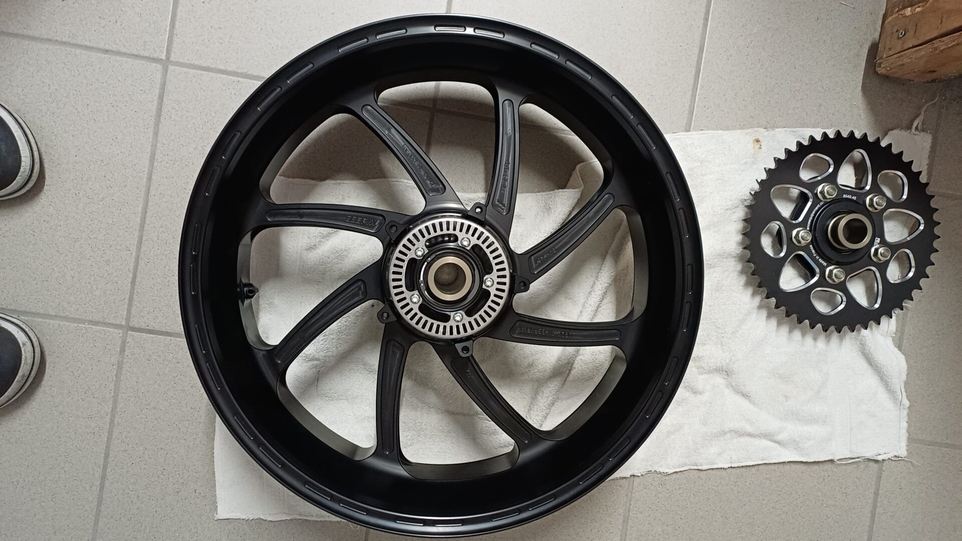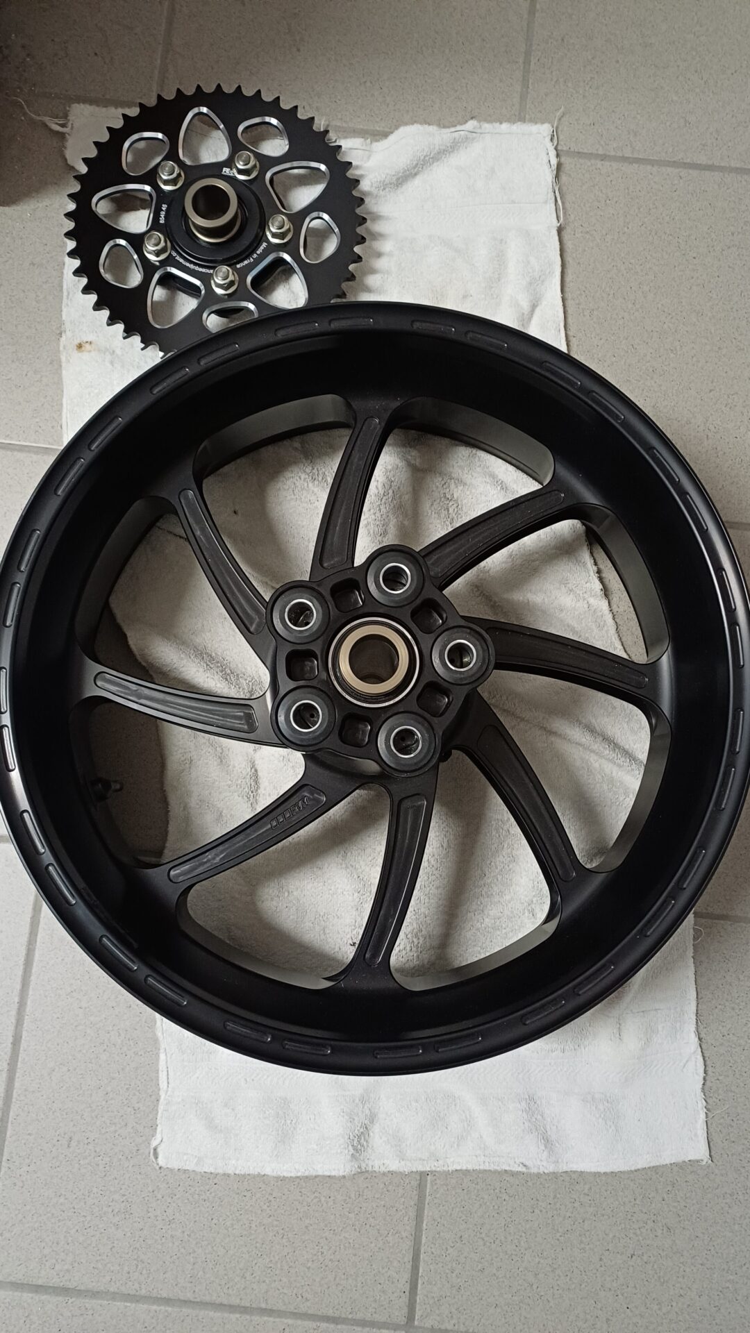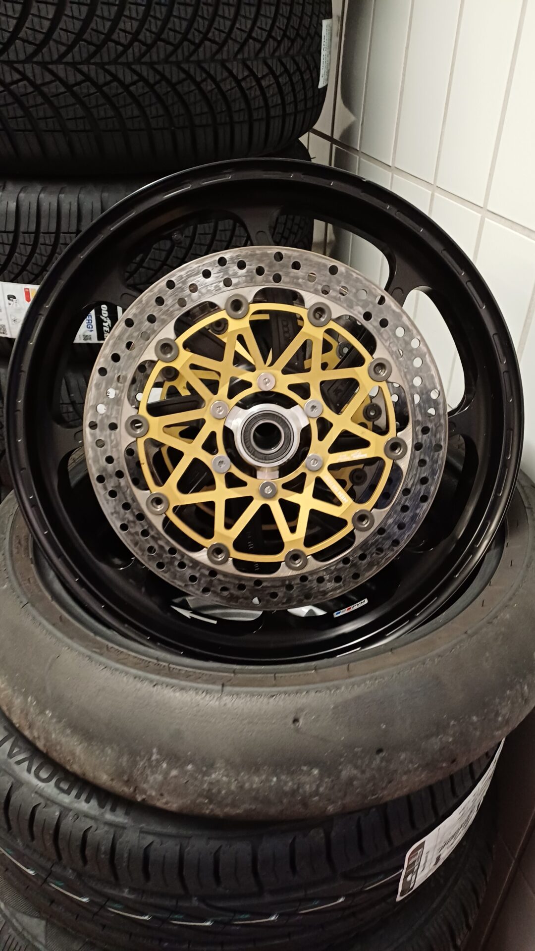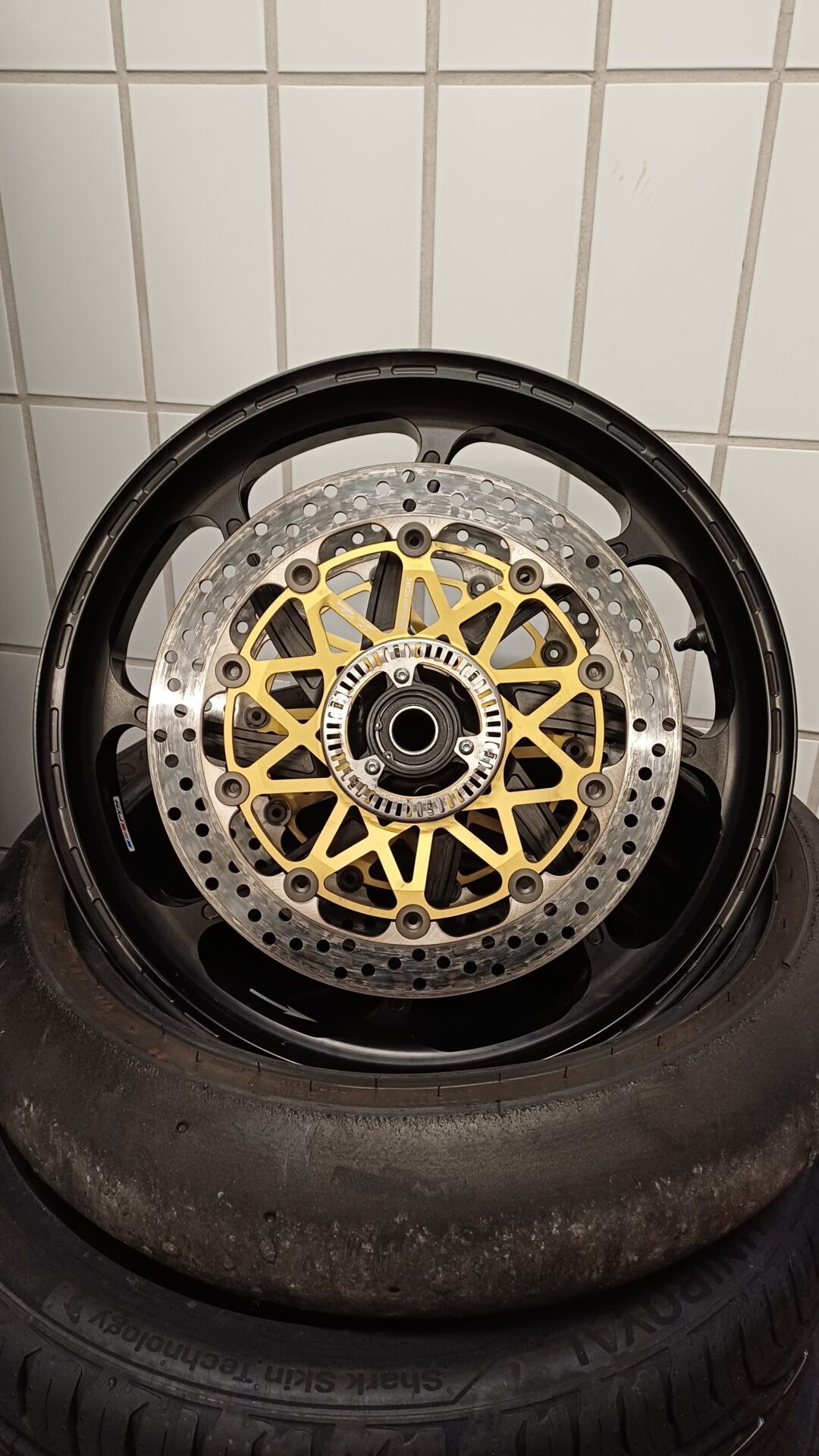 Die vordere Felge habe ich einmal gefahren und ist komplett mit brembo high Performance Bremsscheiben 5,5mm, Sensorring, Buchsen und Winkelventil ausgestattet. Verschleiß an der Scheibe ist nicht messbar!