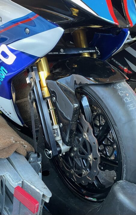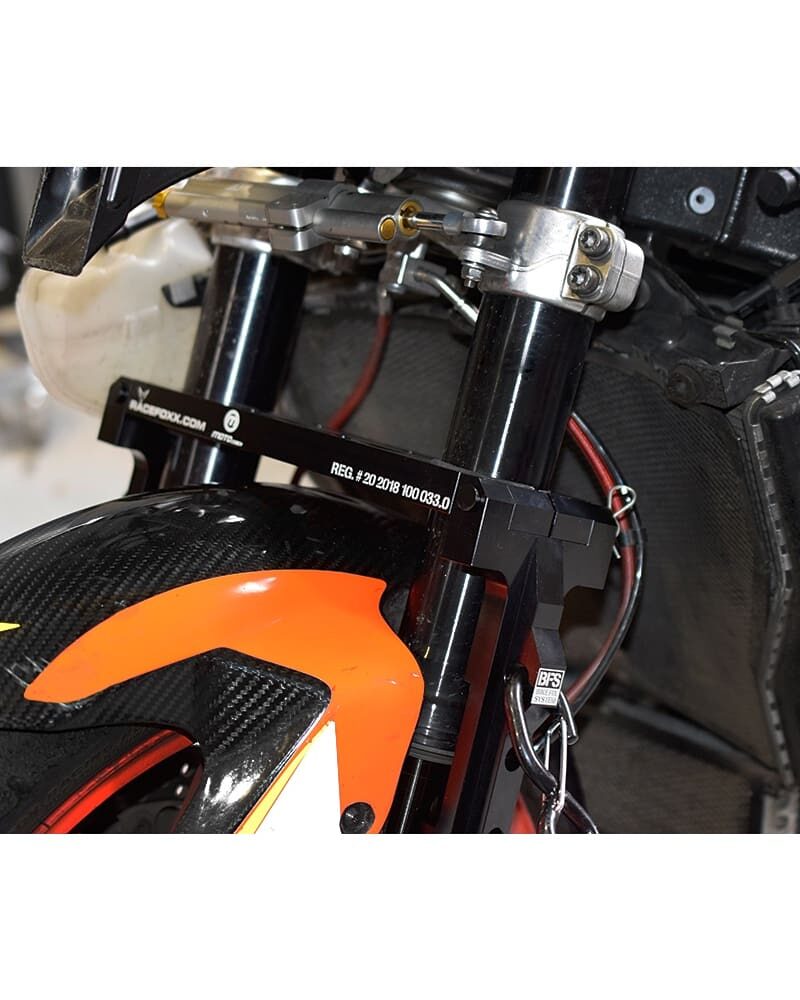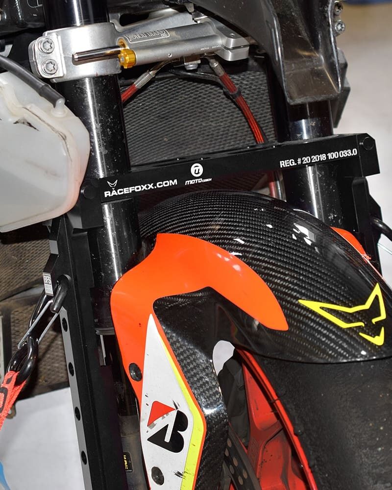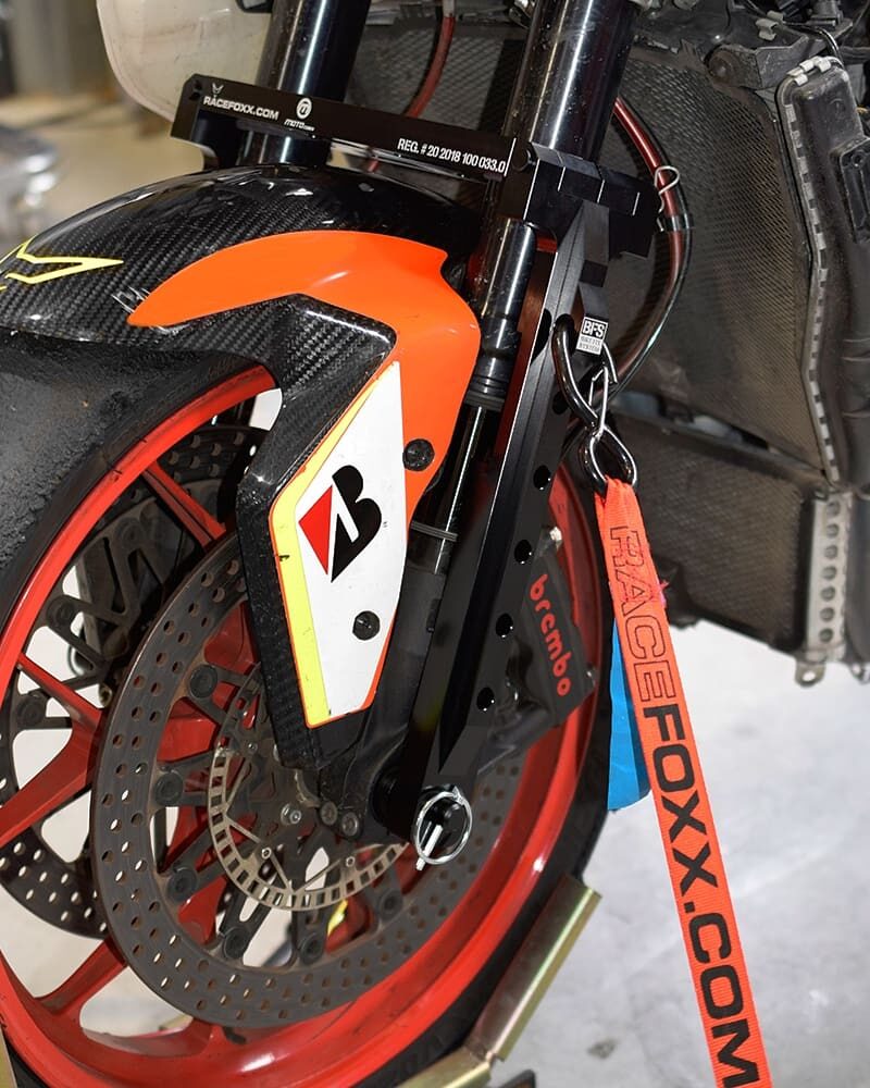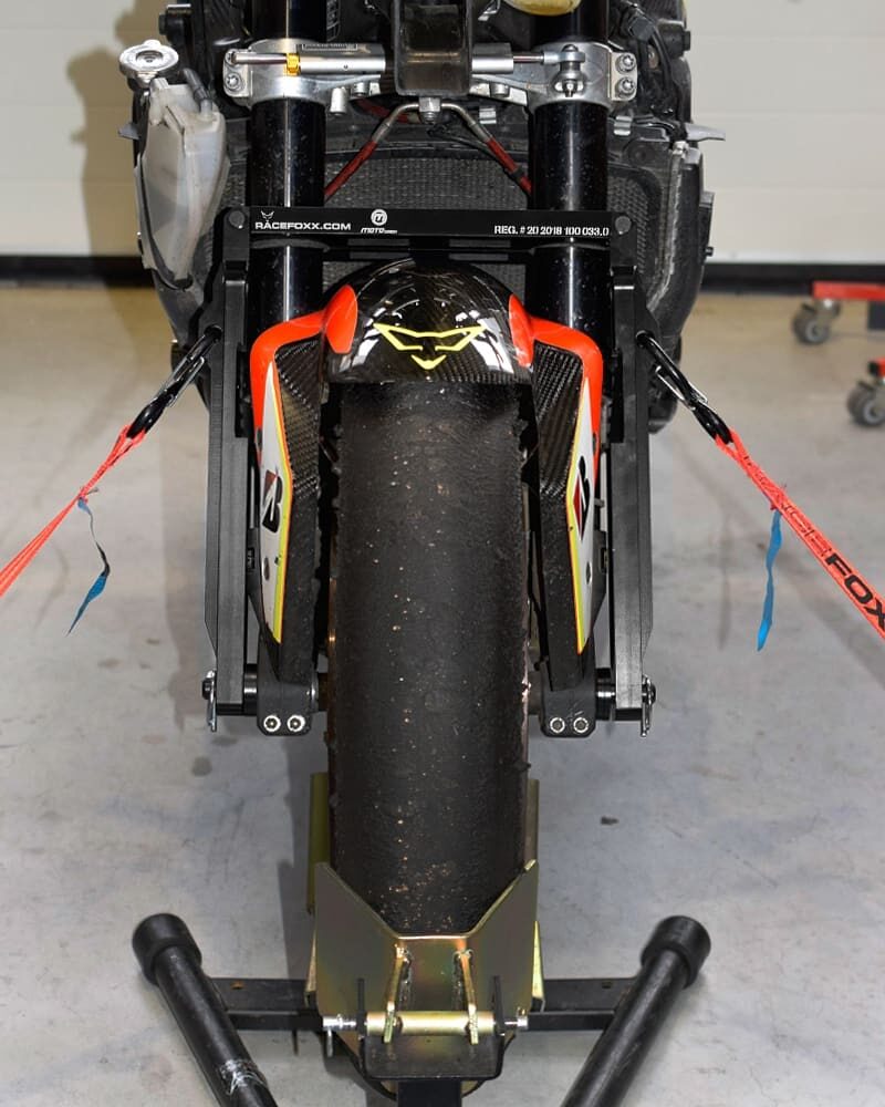 Unser Transport System nimmt das Motorrad an dem Gabelrohre über dem Schwerpunkt, dem Motor.