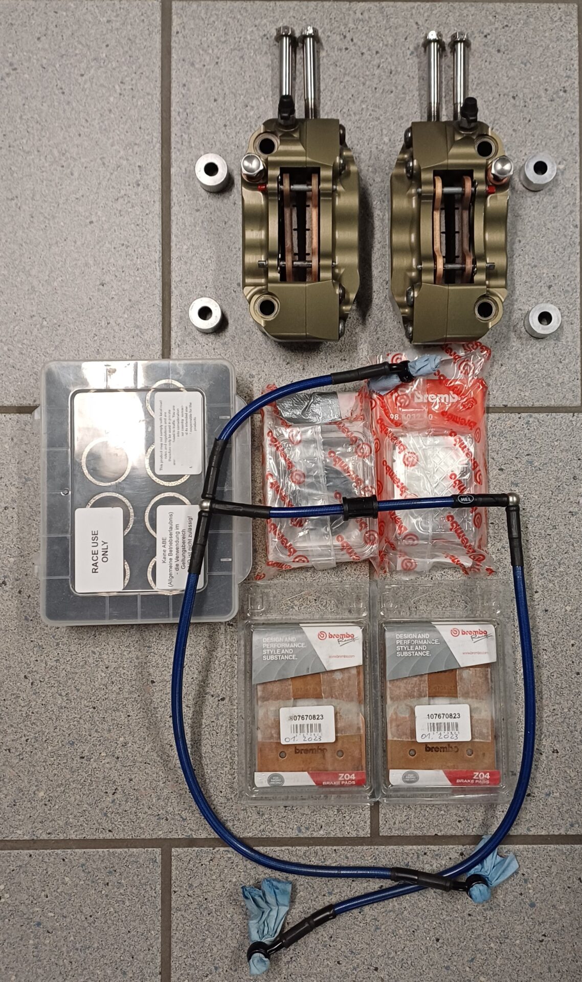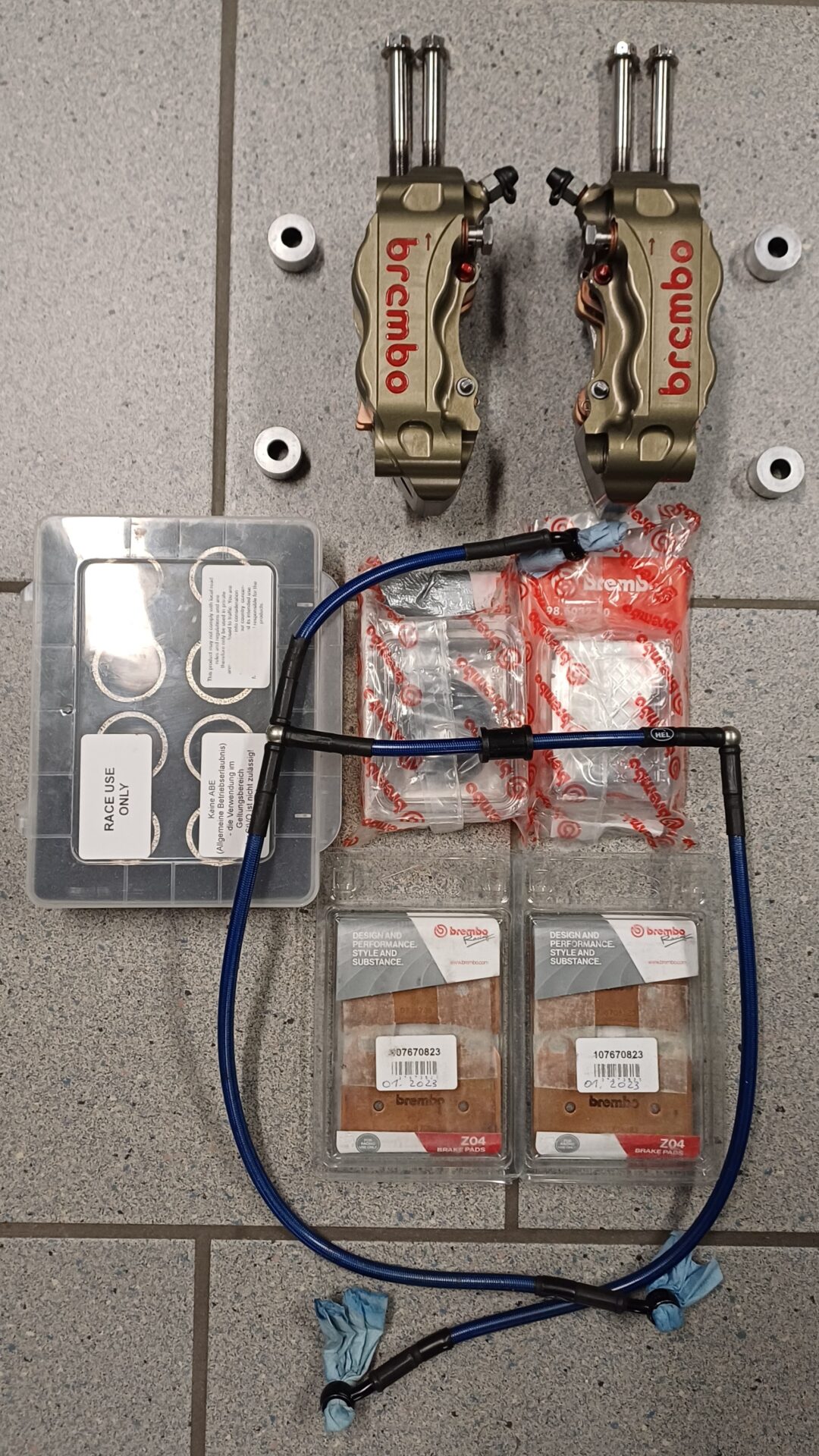 Biete Brembo CNC GP4 30/34 108mm li/re, neue Titankolben, Rep. Satz f. Kolben, neuwertige Bremsbeläge, 1 Garn. Bremsbeläge neu, Spacer - Kit, Bremsleitung. Waren auf einer GSXR1000 L7 montiert.