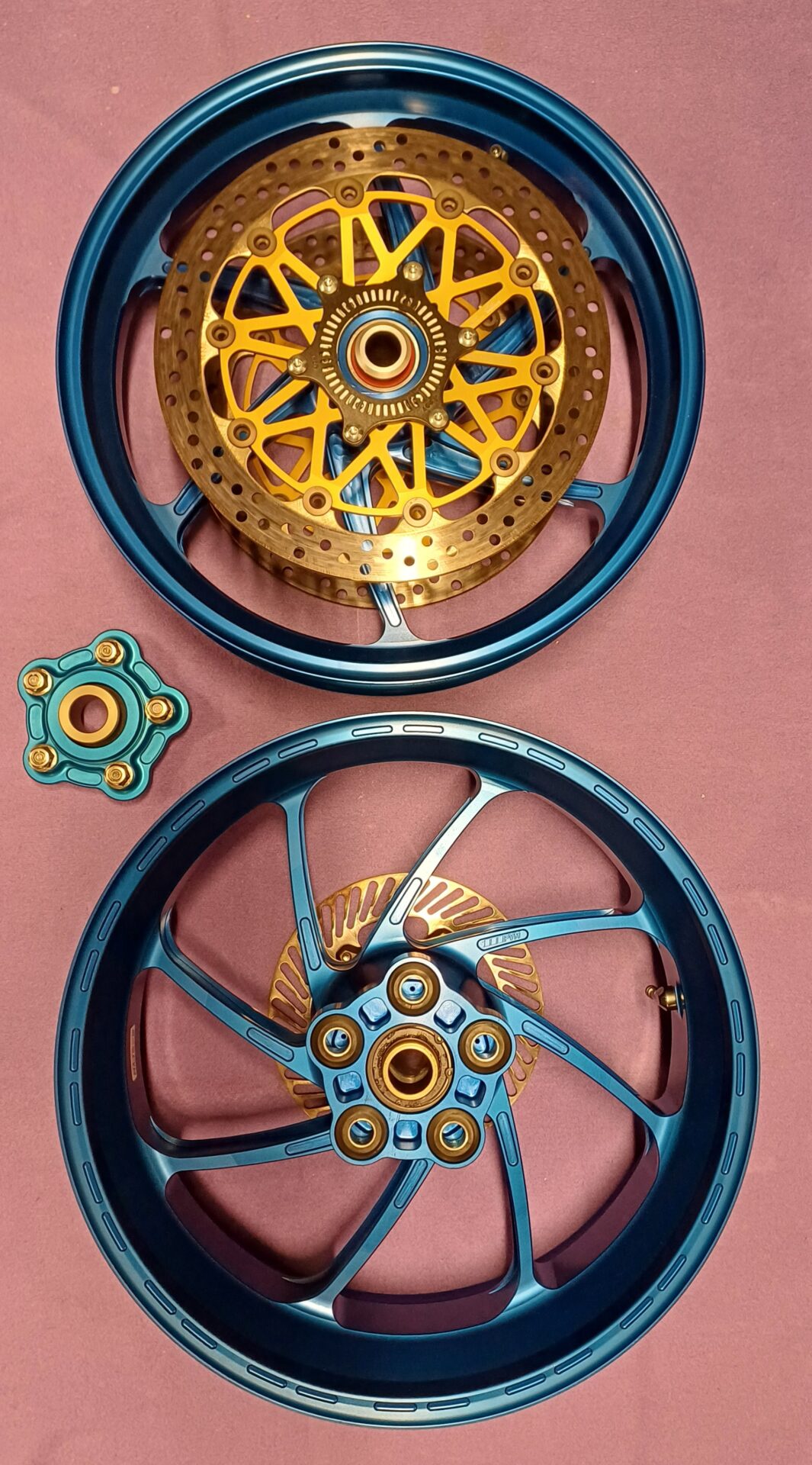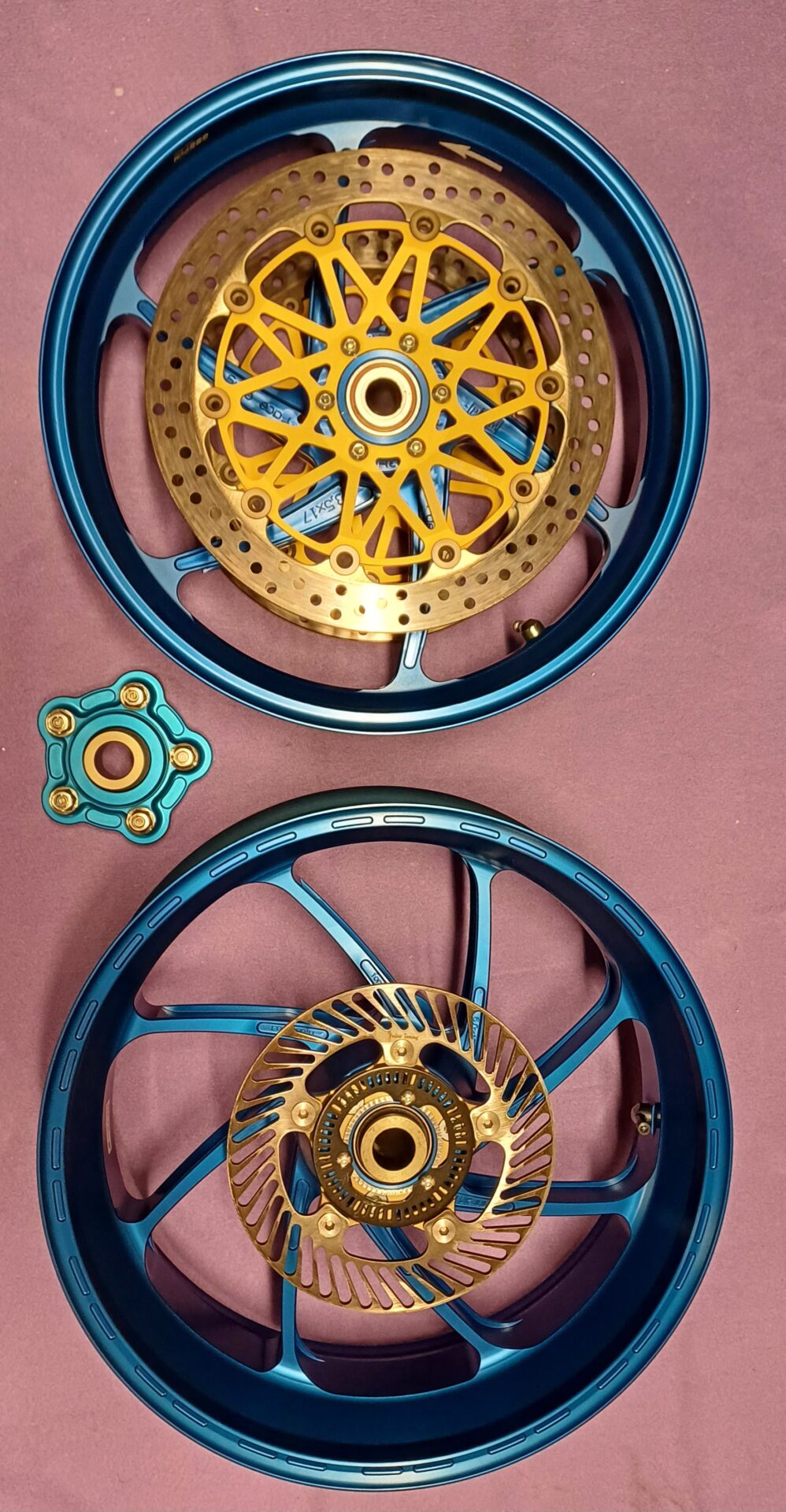 Biete 1 Garn. PVM Felgen, neuwertiger Zustand (Unfallfrei), vorne Brembo Scheiben 5,5 mm, Sensorringe, Alu Winkelventiele, Kettenradträger - kompl. Einbaufertig für Suzuki GSX R1000 ab Bj. 2017.