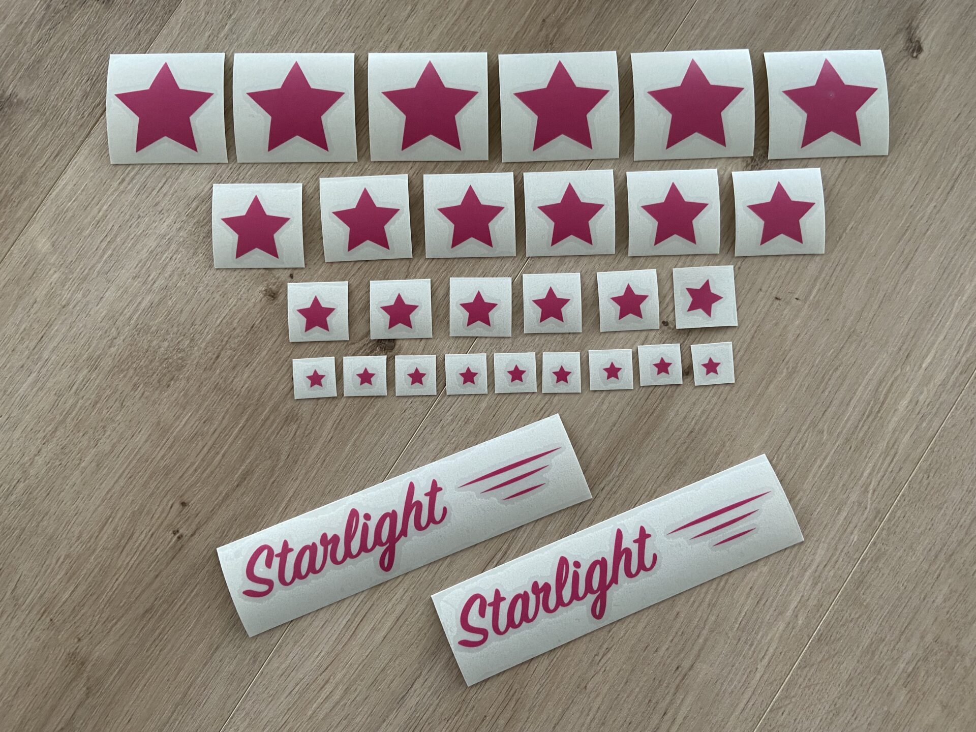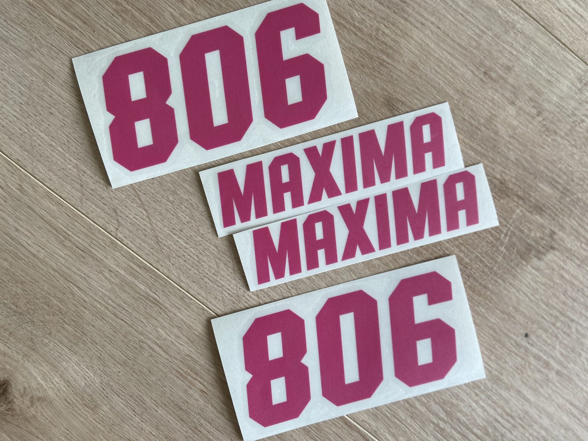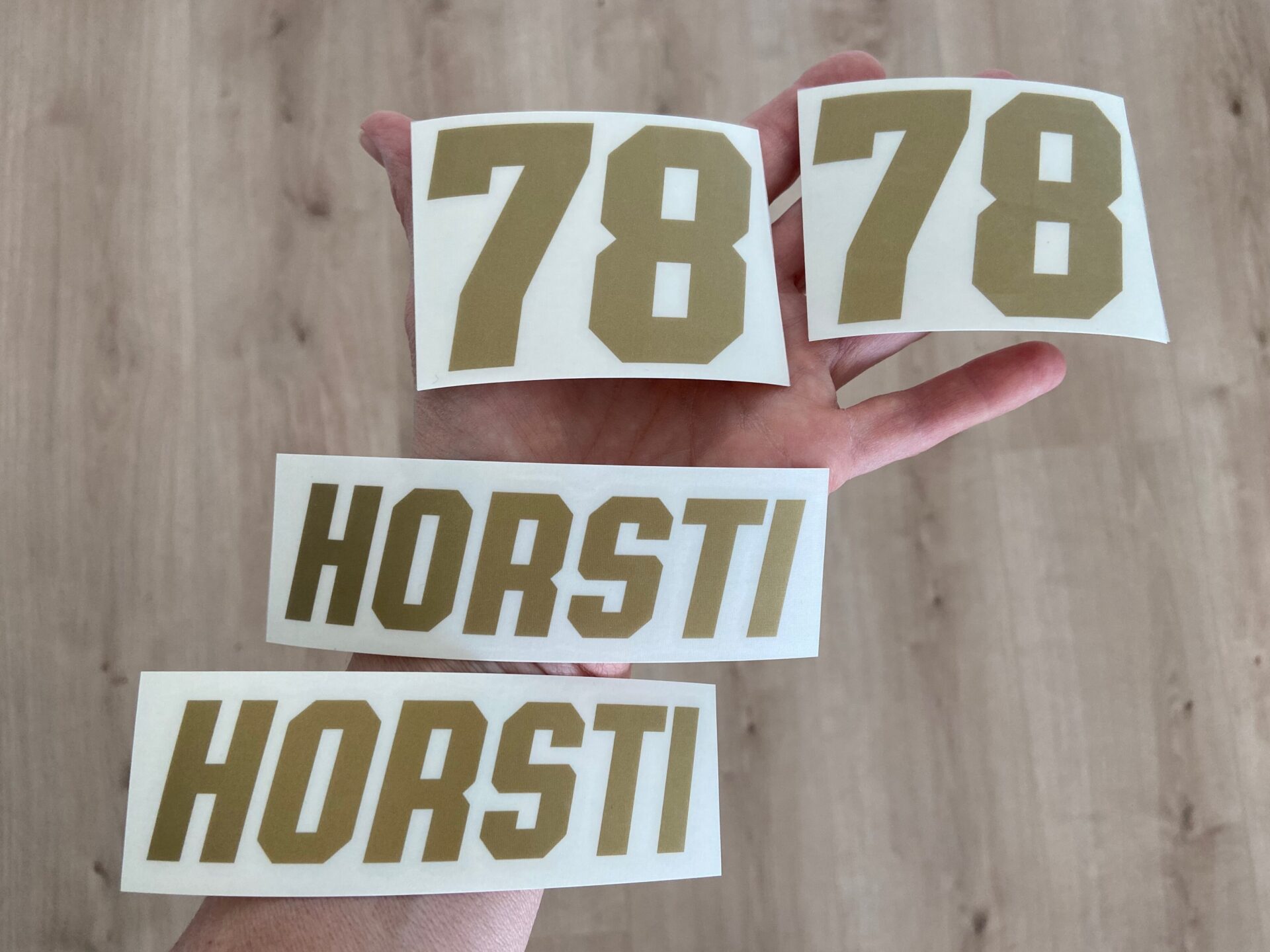 Du erhältst ein Set, bestehend aus 2x Schriftzüge (Höhe je 3 cm) und 2x Startnummern (Höhe je 6 cm).