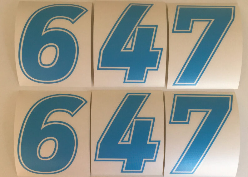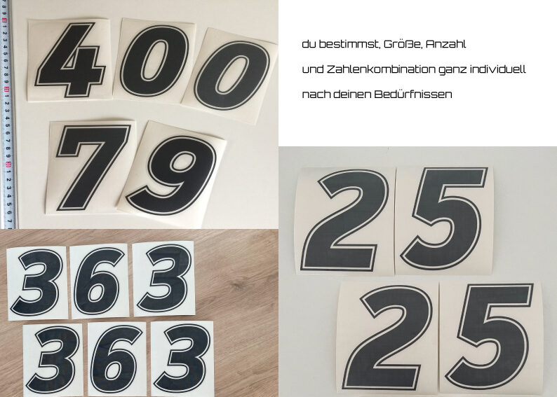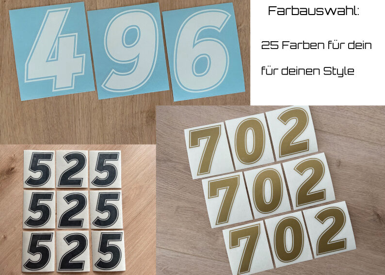 Einfach zu genieren, dank großer Vielfalt. Individuelle Motorrad Startnummern in Wunschfarbe und Wunschhöhe. Aufkleber im einfarbigen Folienschnitt für Motocross Rennstrecke, Enduro Bike, Pitbike, MTB, Motorrad Rennen, MX Racing, Auto, Roller, BMX, Superbike Track, Supermoto Race, Quad und Scooter.