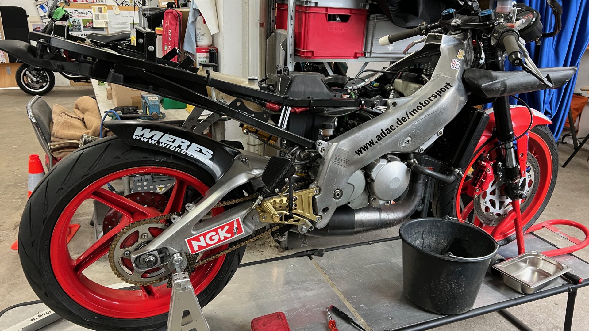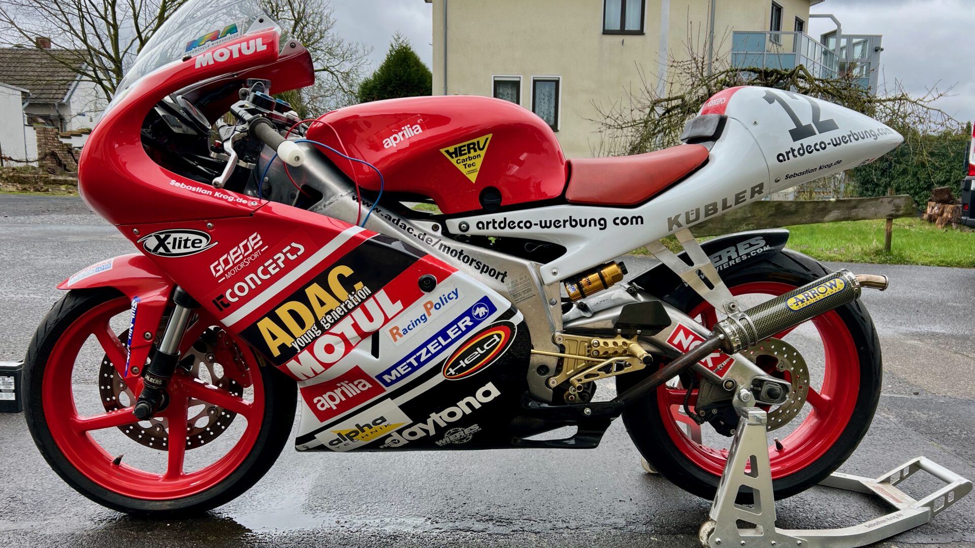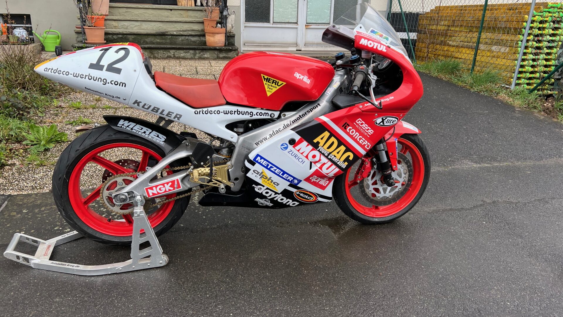 Die Aprilia stammt aus dem Umfeld des Rennsports (ähnlich ADAC Junior Cup Spezifikation). Sie wurde technisch gepflegt, weist aber natürlich die typische Patina eines ehrlichen Rennstrecken-Fahrzeugs auf. Mit dem Öhlins/Wilbers-Fahrwerk ist sie technisch auf einem Top-Niveau.