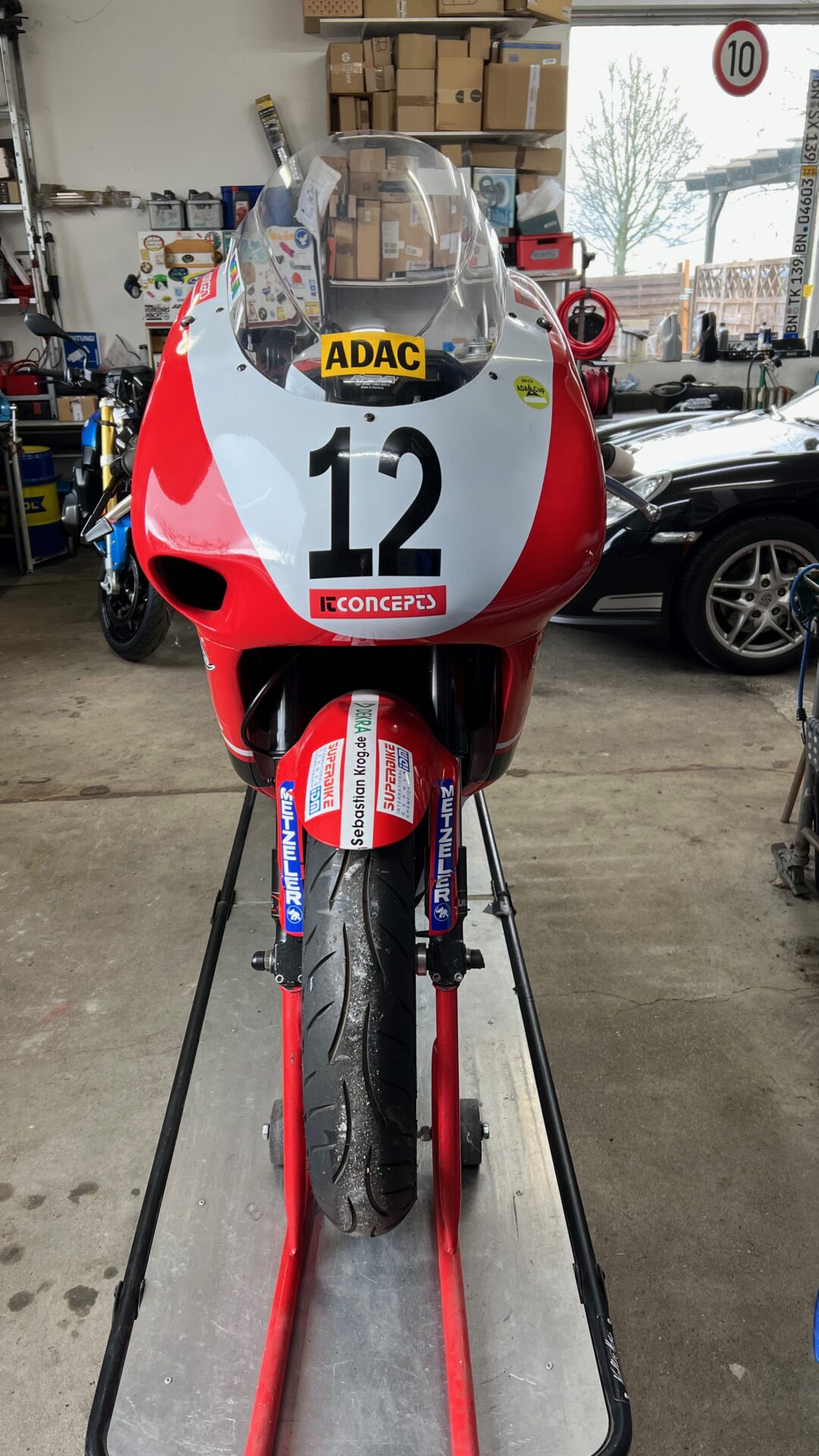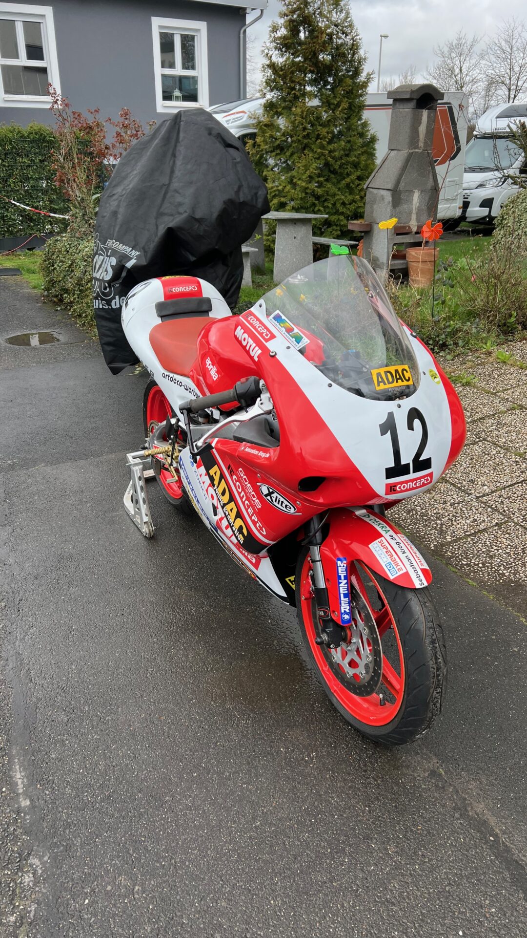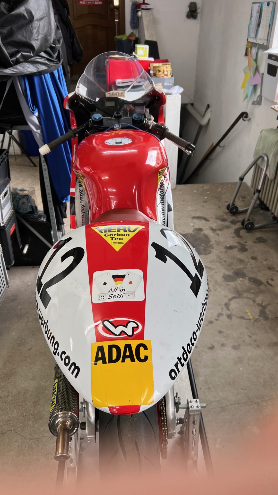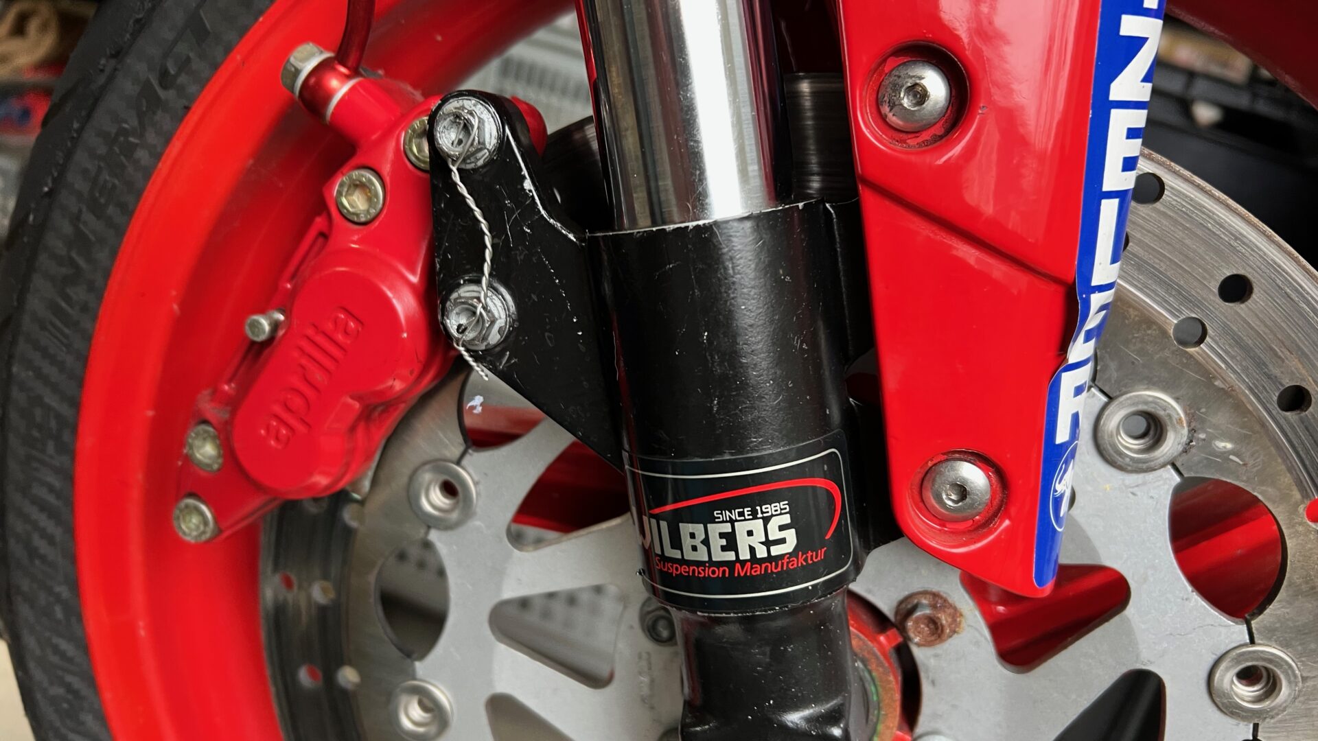 Die Aprilia stammt aus dem Umfeld des Rennsports (ähnlich ADAC Junior Cup Spezifikation). Sie wurde technisch gepflegt, weist aber natürlich die typische Patina eines ehrlichen Rennstrecken-Fahrzeugs auf. Mit dem Öhlins/Wilbers-Fahrwerk ist sie technisch auf einem Top-Niveau.