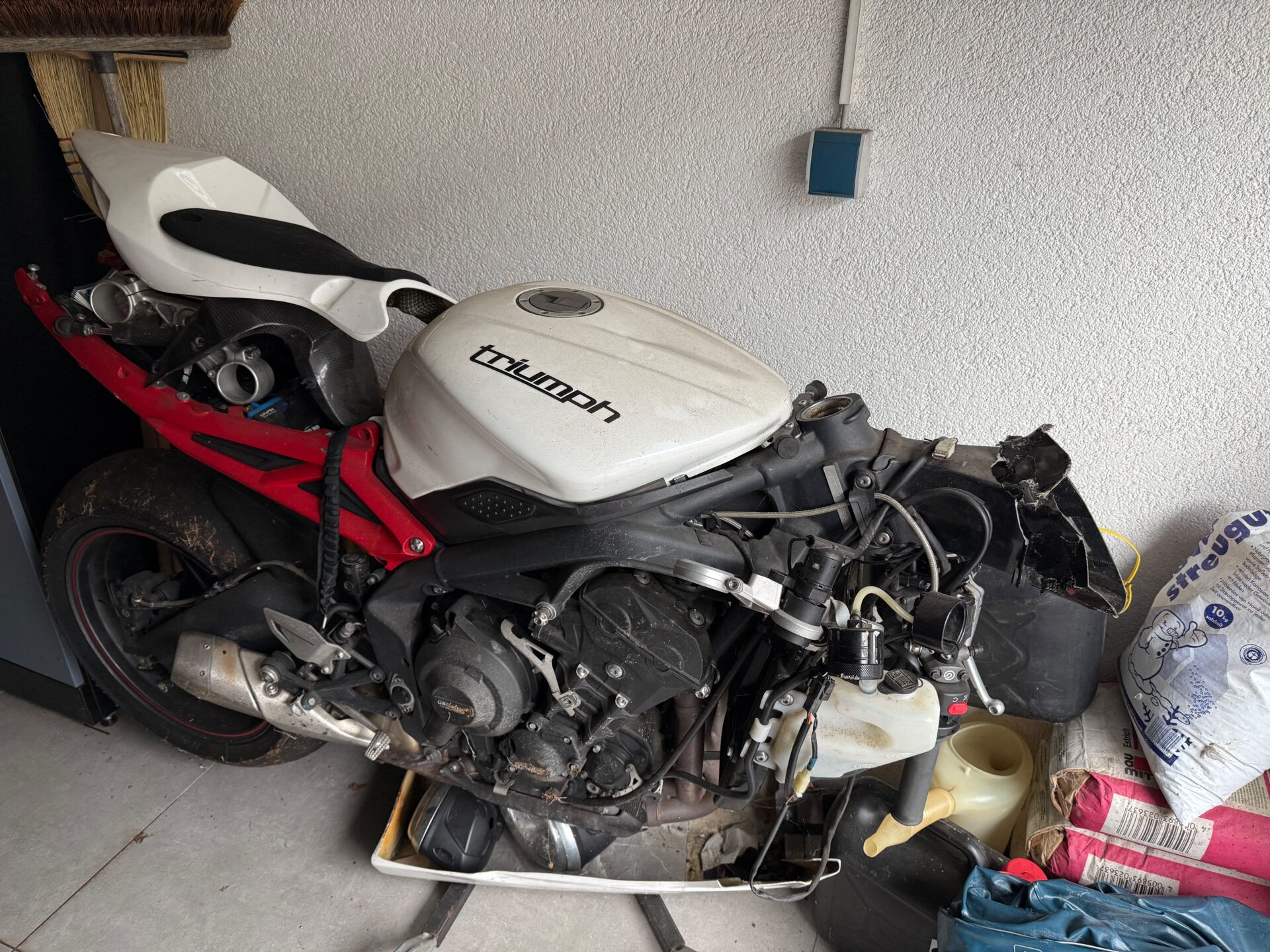 Ich biete eine Triumph Daytona 675R mit Unfallschaden. Beide Felgen sind in Ordnung, der Motor läuft. Die Gabel ist vorhanden (aktuell ausgebaut), aber krumm.