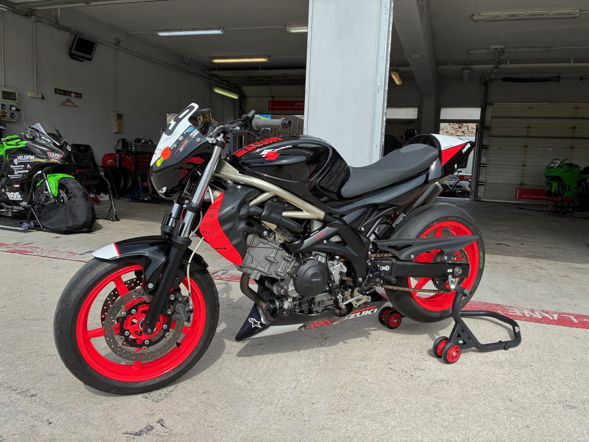 Schöne Suzuki Gladius mit Mupo-Federbein, anderen Gabelfedern, LSL Rasten, Magura-Bremspumpe, Stahlflexleitungen, BOS Endschalldämpfer mit DB-Eater, Alu-Kettenrad, Racing-Tankdeckel, Schaltautomat, Kurzhubgasgriff, Pirelli Diablo Superbike 120/160,