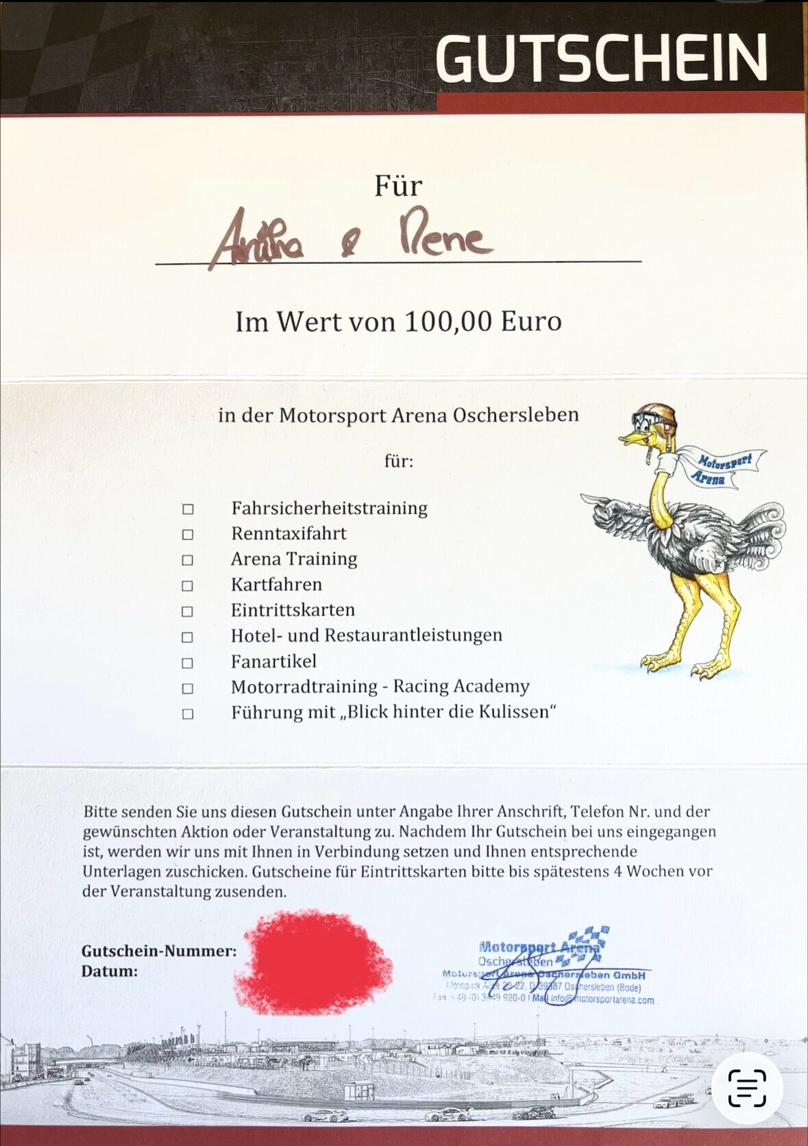 ich biete einen 100€ Gutschein für Oschersleben an. Dieser ist direkt von der Motorsport Arena ausgestellt und ist für Trainings, Gastro, Hotel und Veranstaltungstickets einlösbar.