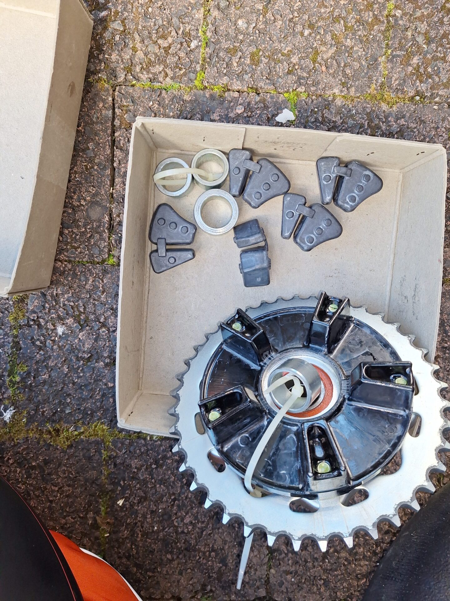 Kompl. mit maßhaltigen Bremsscheiben, Kettenradträger, Ruckdämpfer und Hülsen an.