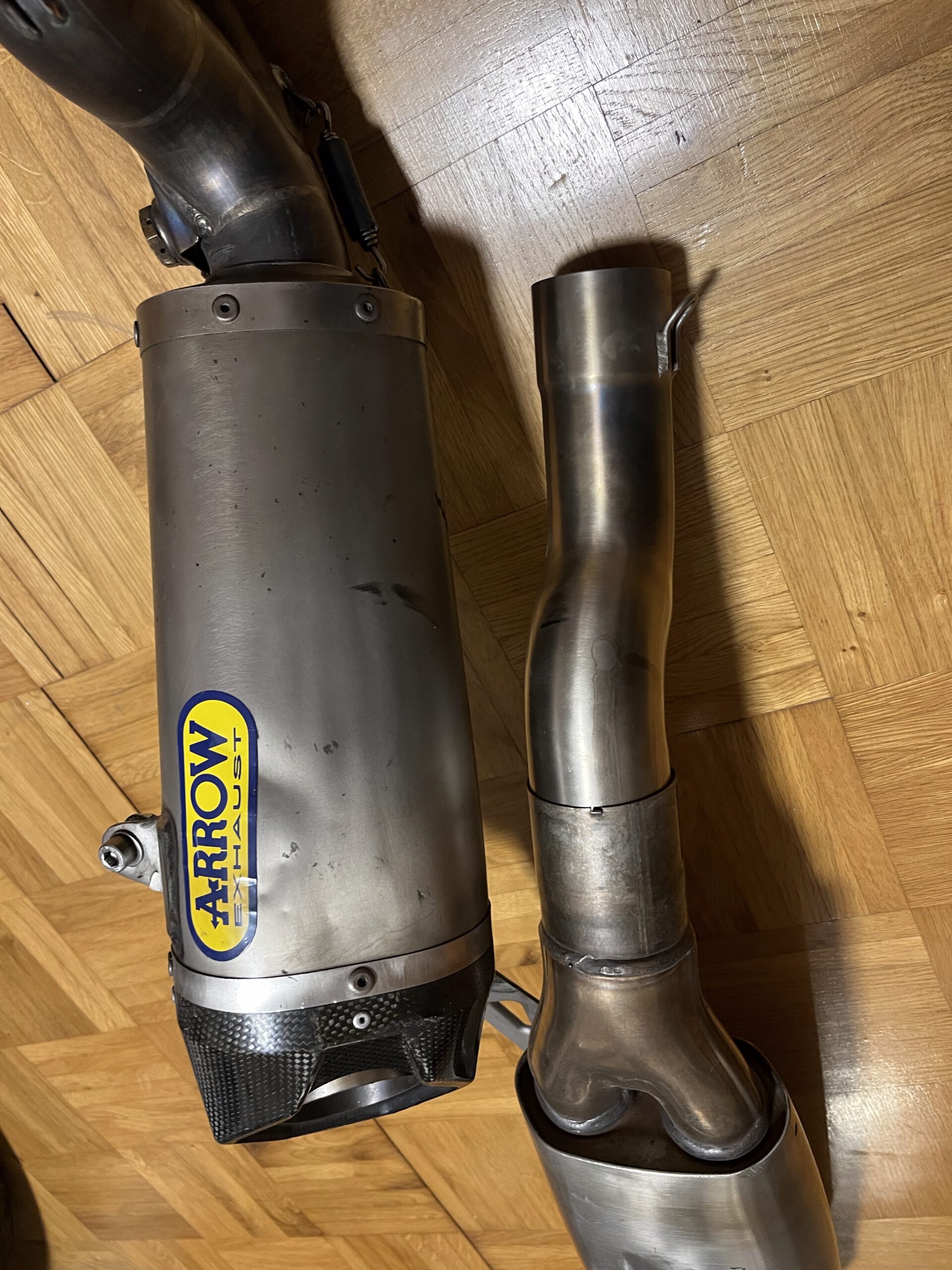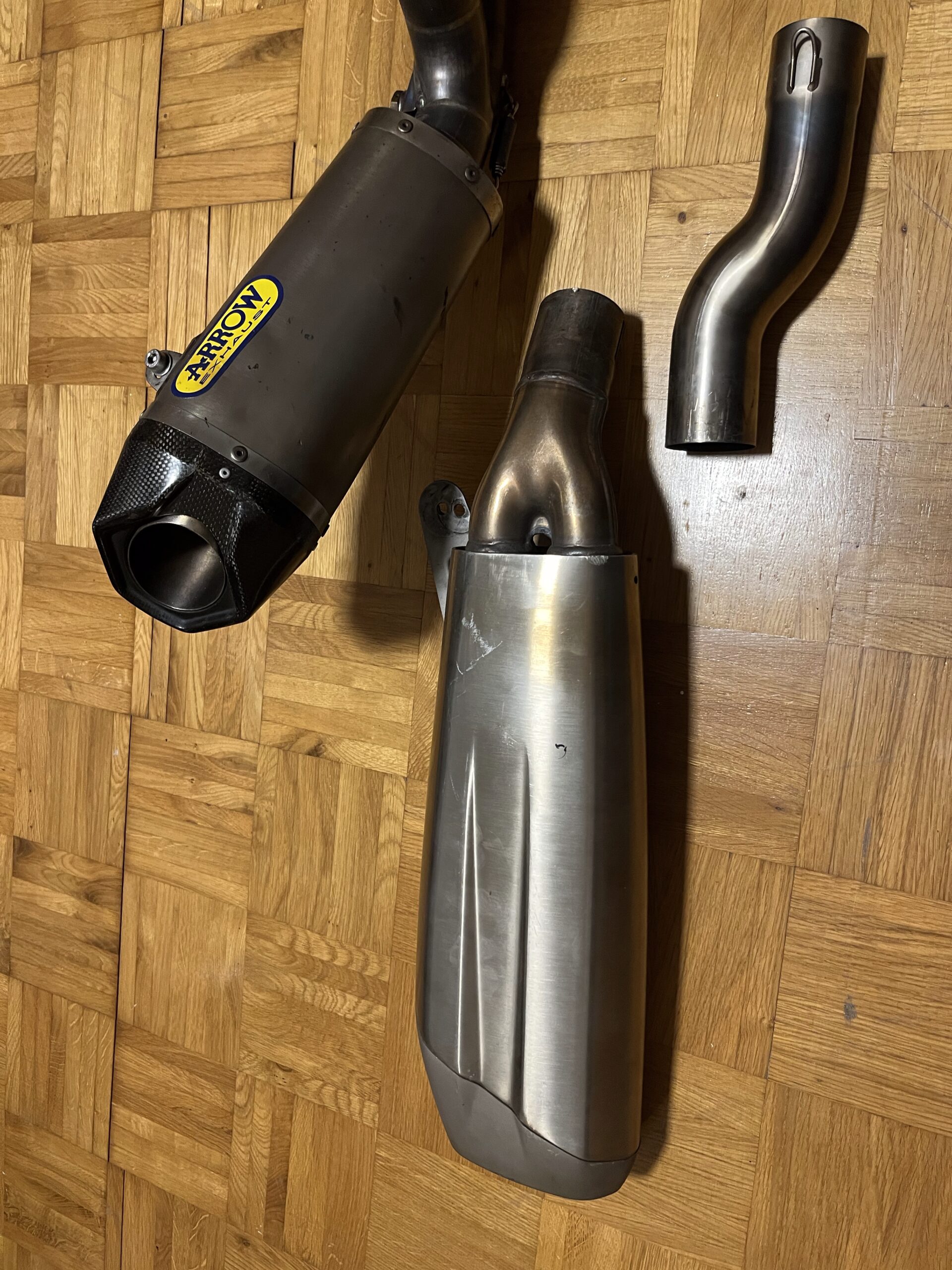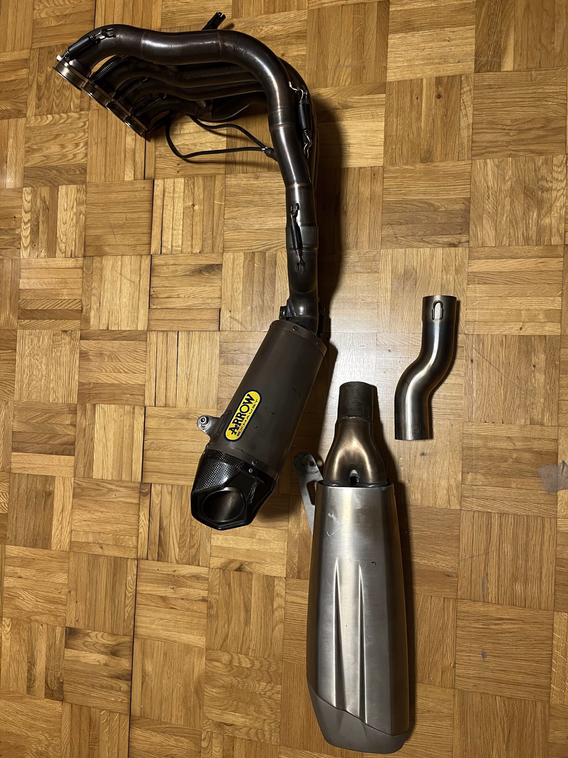 Biete hier meine Arrow Komplettanlage inkl. Adapterrohr für den Original Dämpfer und orig. Dämpfer an. Damit muss die komplette Anlage nicht demontiert werden wenn z.B. strenge Lärmgrenzen wie auf dem Sachsenringe gelten oder das Motorrad auch zwischen durch auf der Straße bewegt werden soll.
